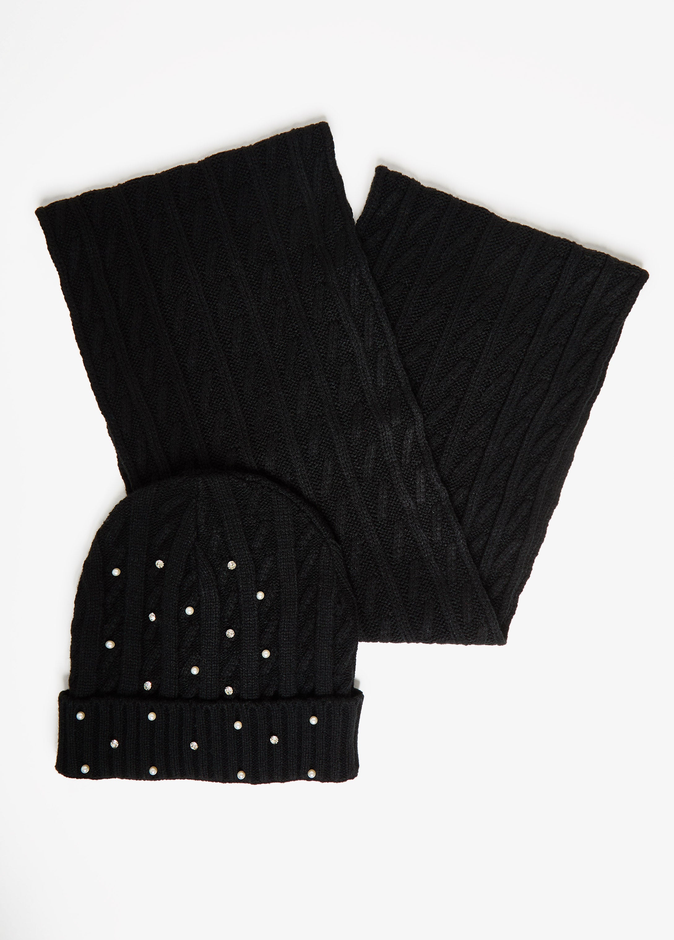 Share a little holiday sparkle with our cable-knit hat and scarf gift set trimmed with crystals and faux pearls. Soft, luxe and ready to wrap up your winter looks...or someone special on your list.