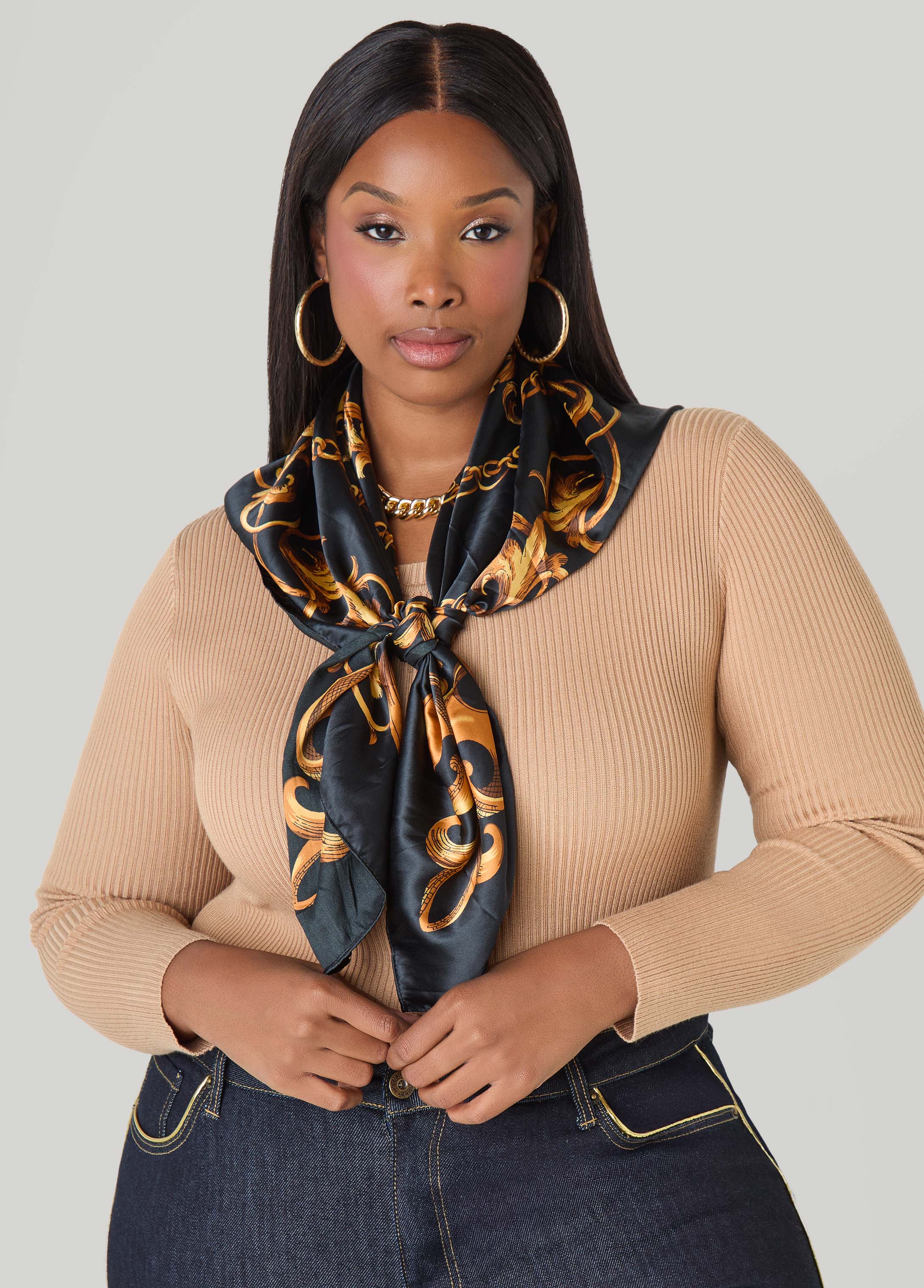 This satin scarf is stamped with a trendy status print that's chic, current & perfect to add a dose of luxe flair.