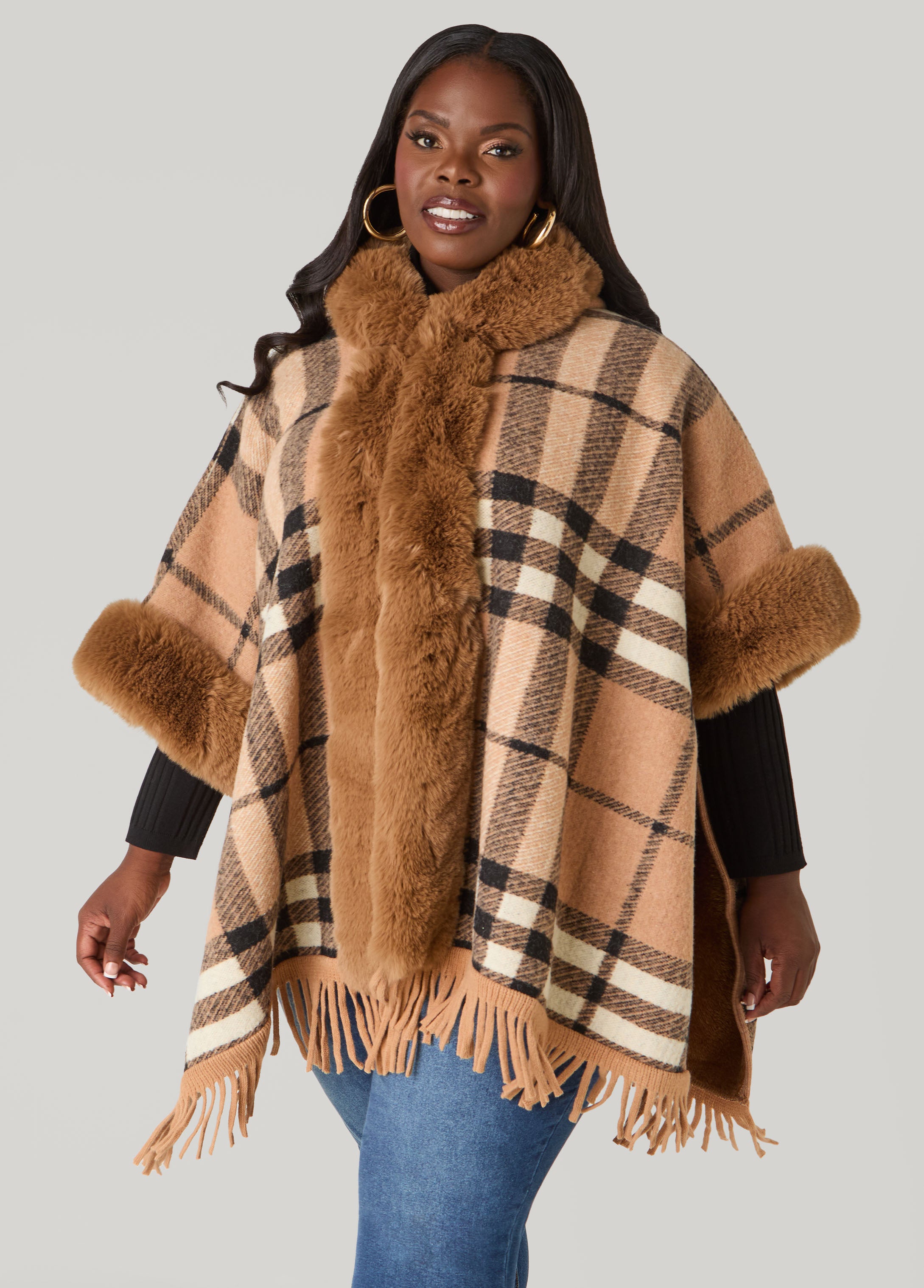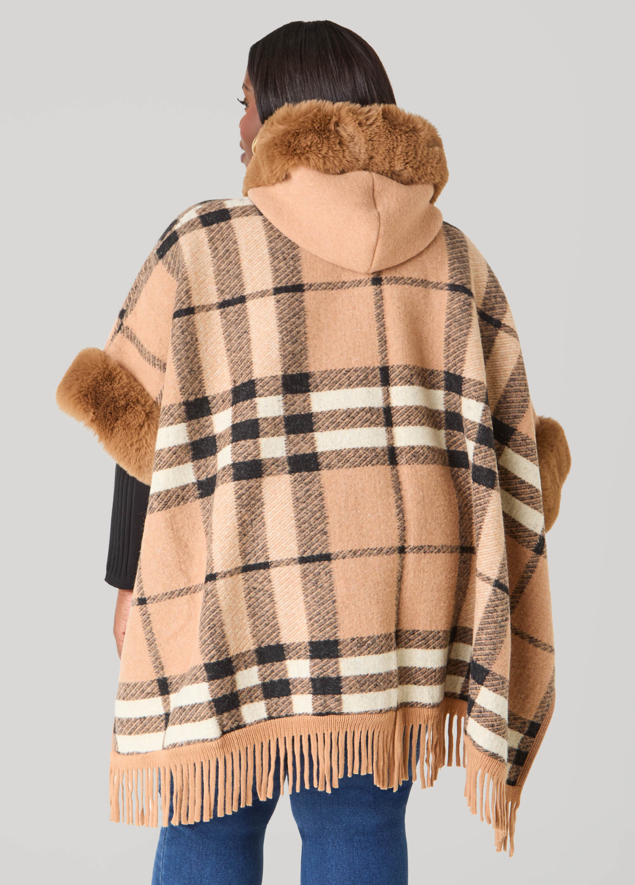 Our Adrienne Vittadini checked brushed-knit ruana brings cozy-chic to your look with its hood, fringed edges and plush faux fur trims. A designer layer that mixes comfort with statement-worthy style.