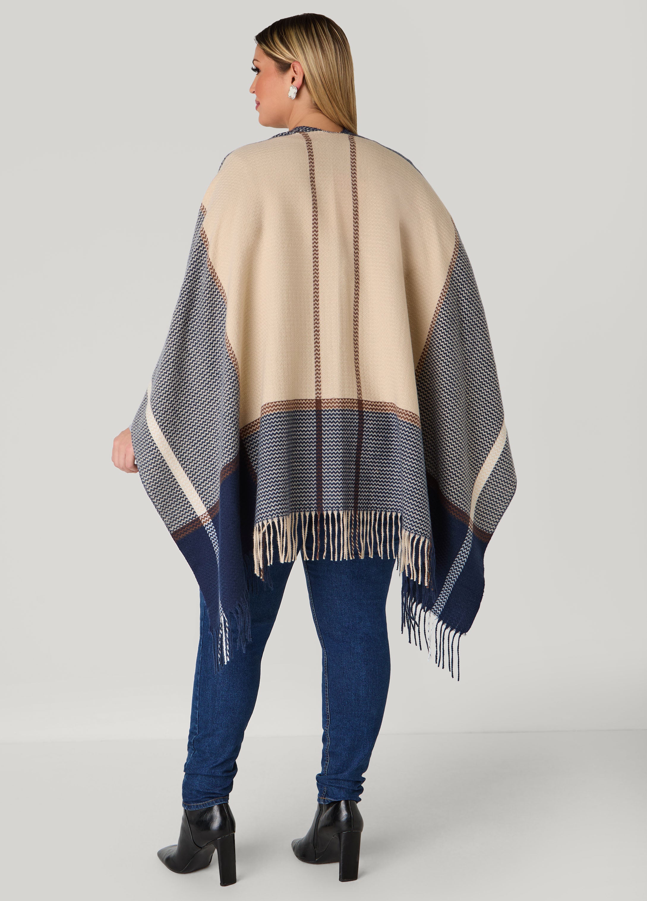 Plaid meets chevron in a knit poncho that knows how to layer. Finished with swingy fringe and an open front made for throw-on ease, it’s the shortcut to cozy-chic.