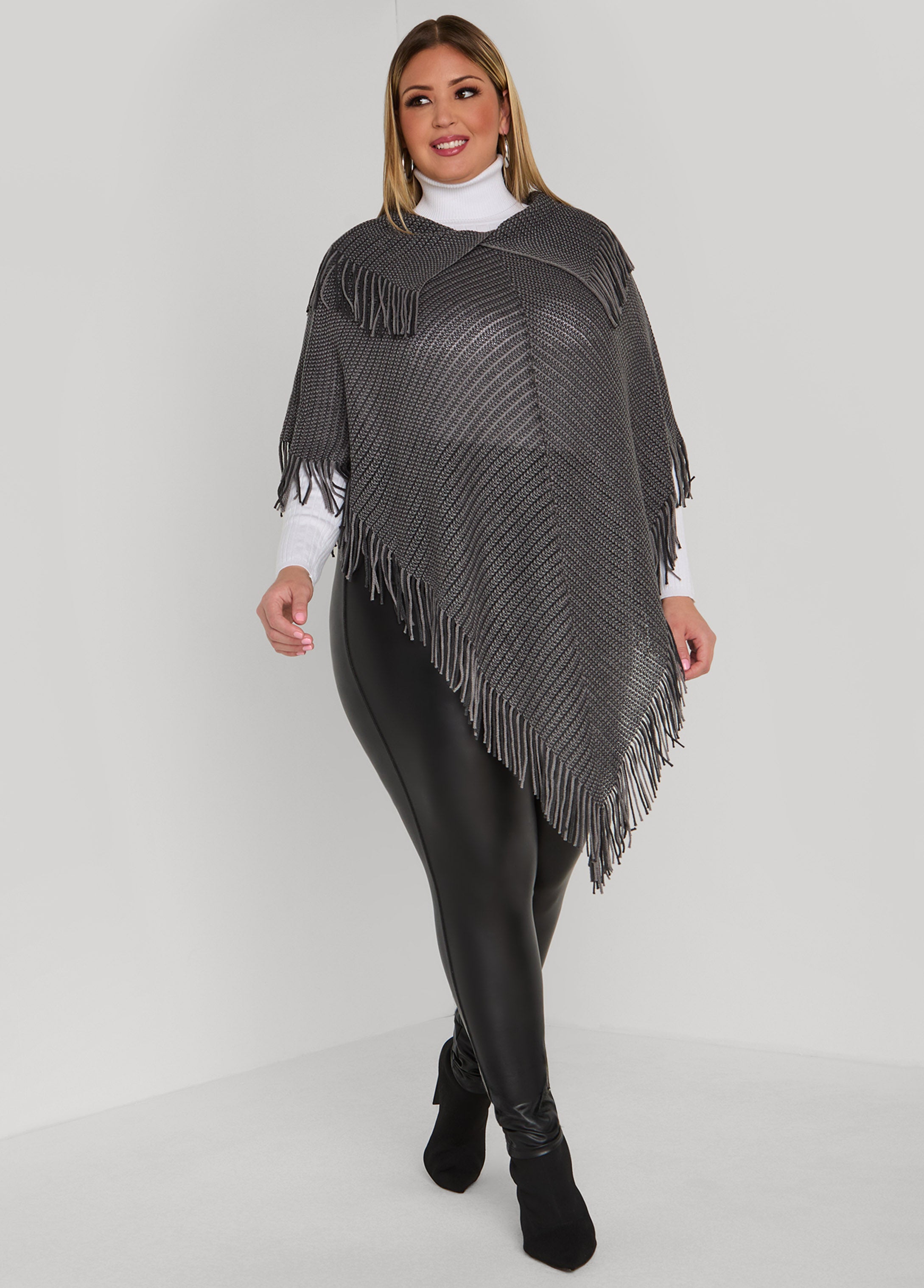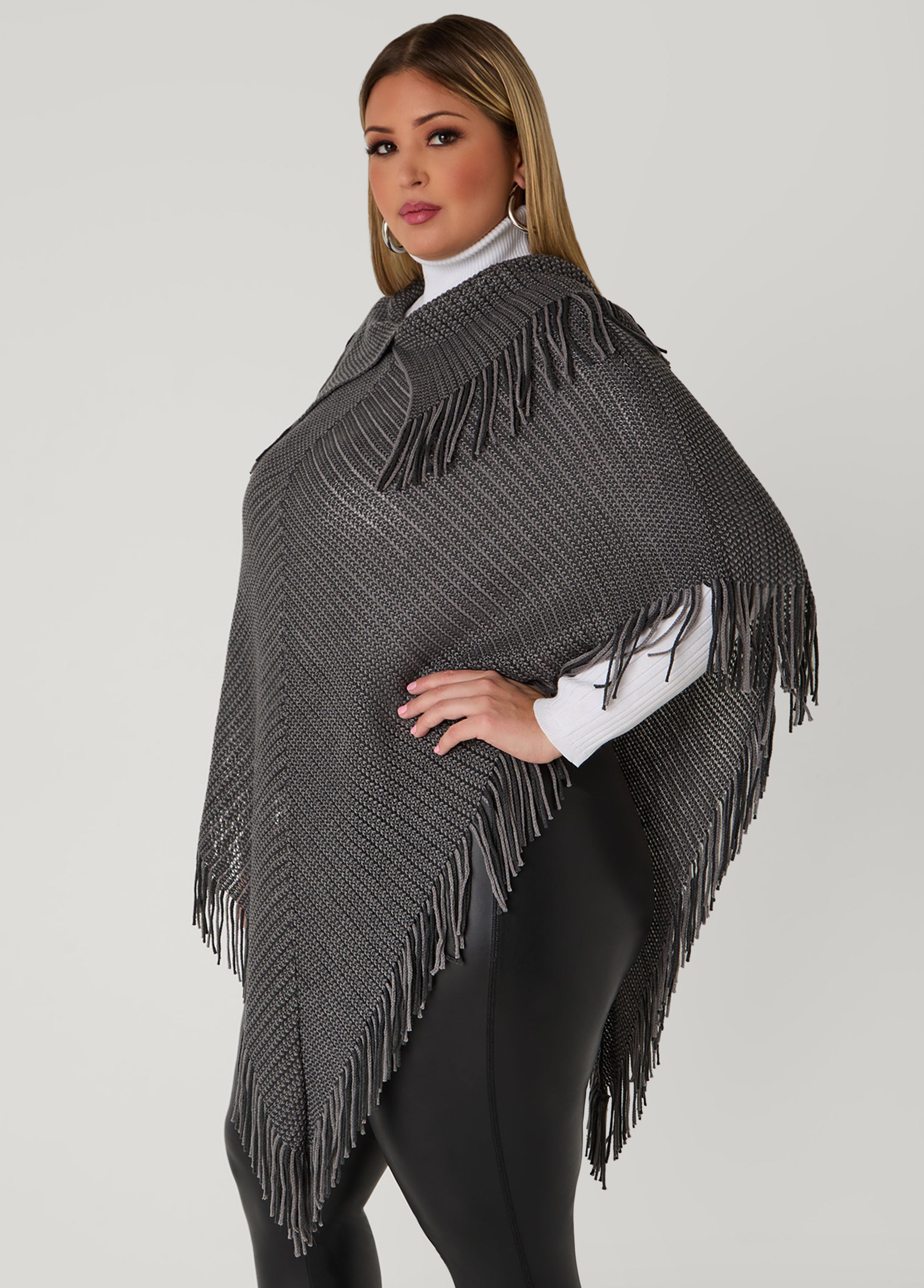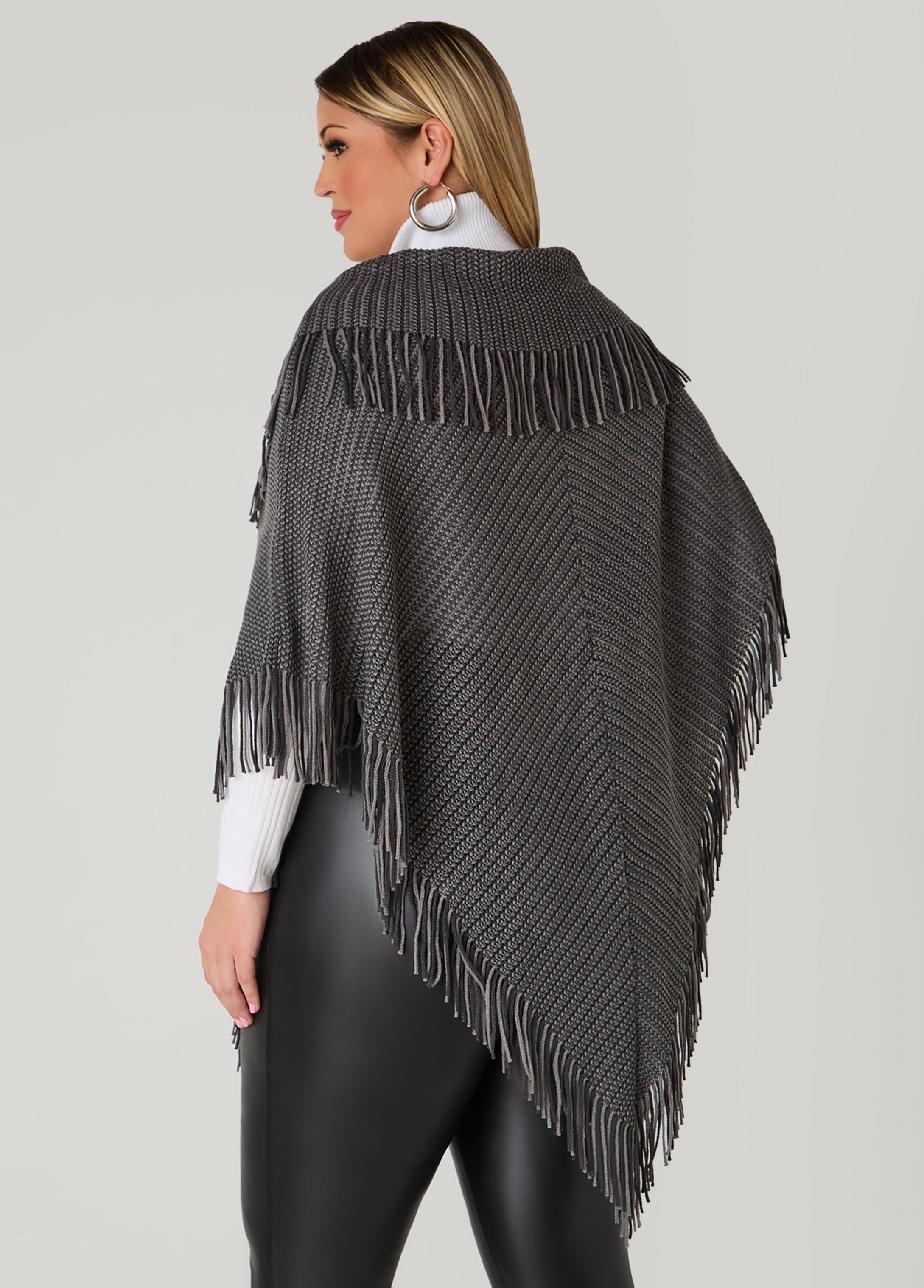 Turn casual into couture with this fringed ribbed-knit poncho. V hemline and foldover neckline make slipping on luxe a breeze.