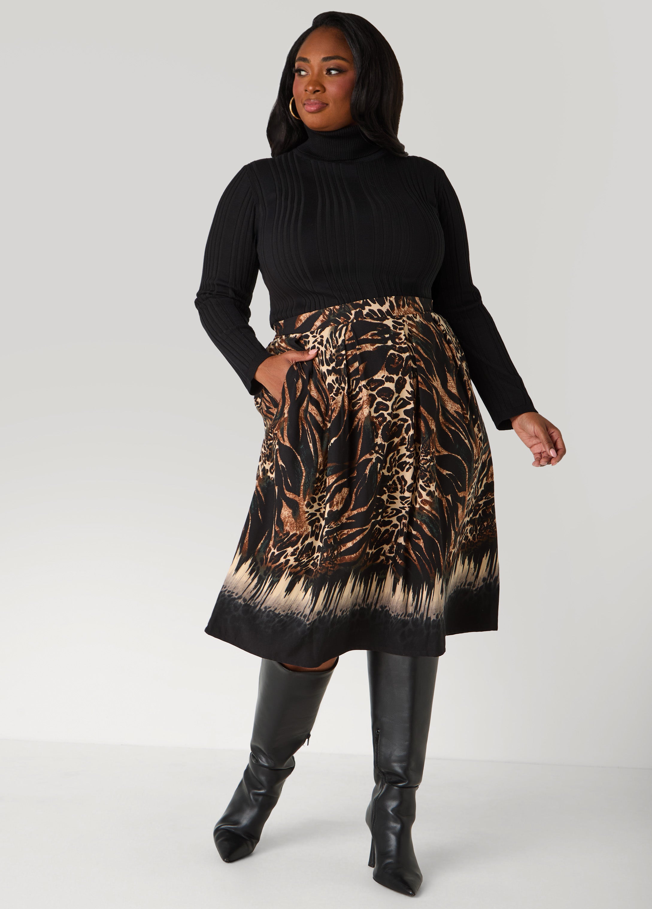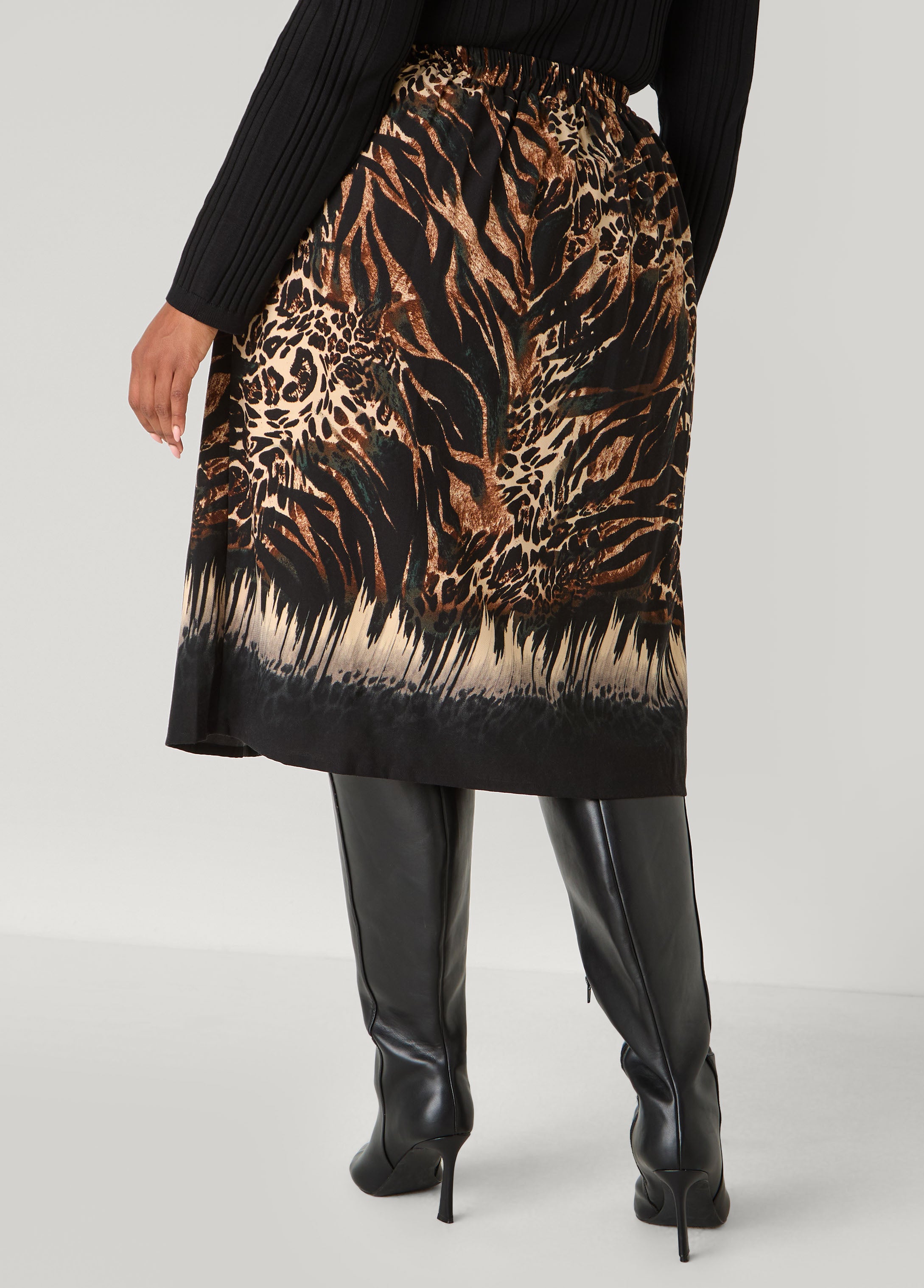 Animal patterns are pleated into a ripple across a midi A-line cut skirt with an elasticized waist for shape and functional slit pockets.