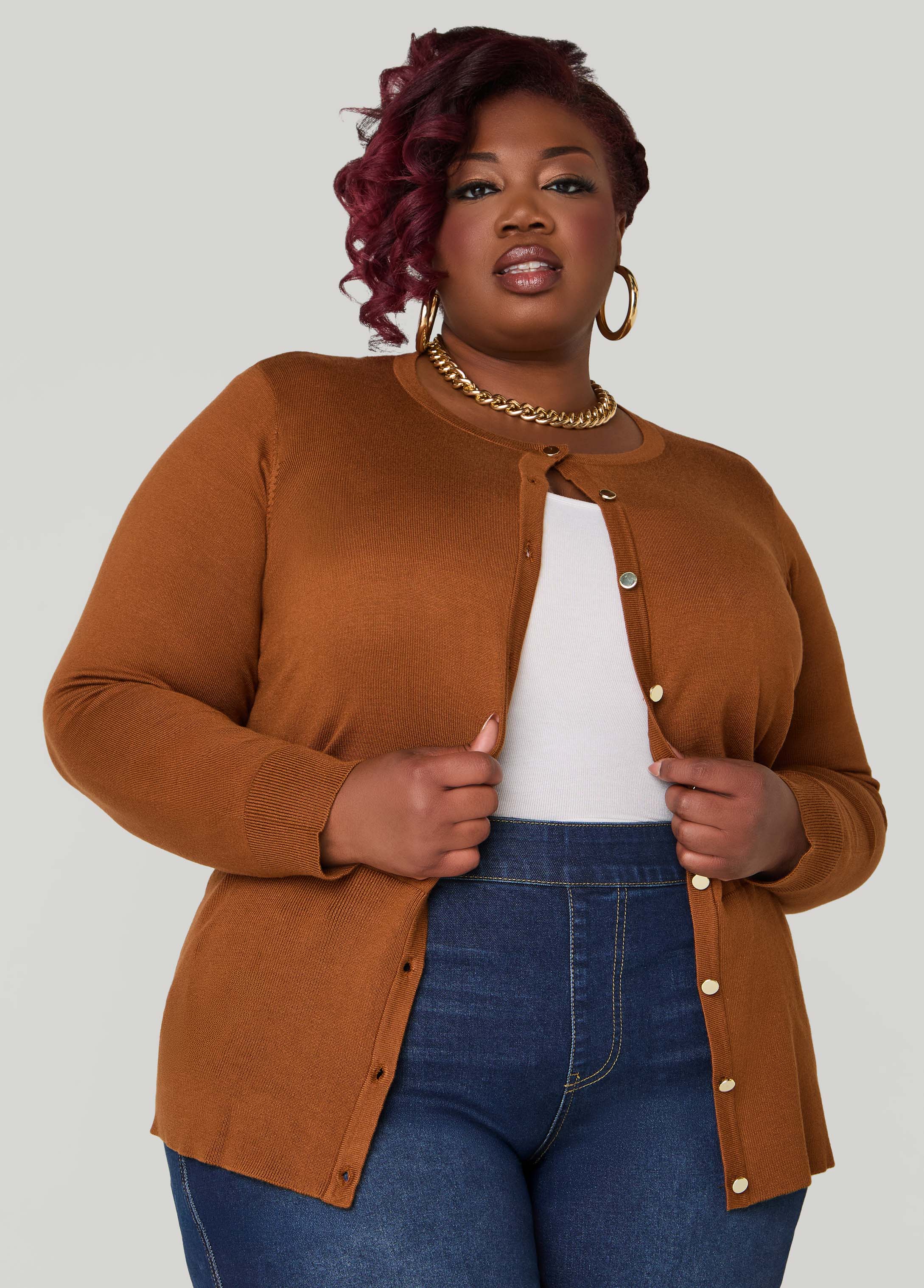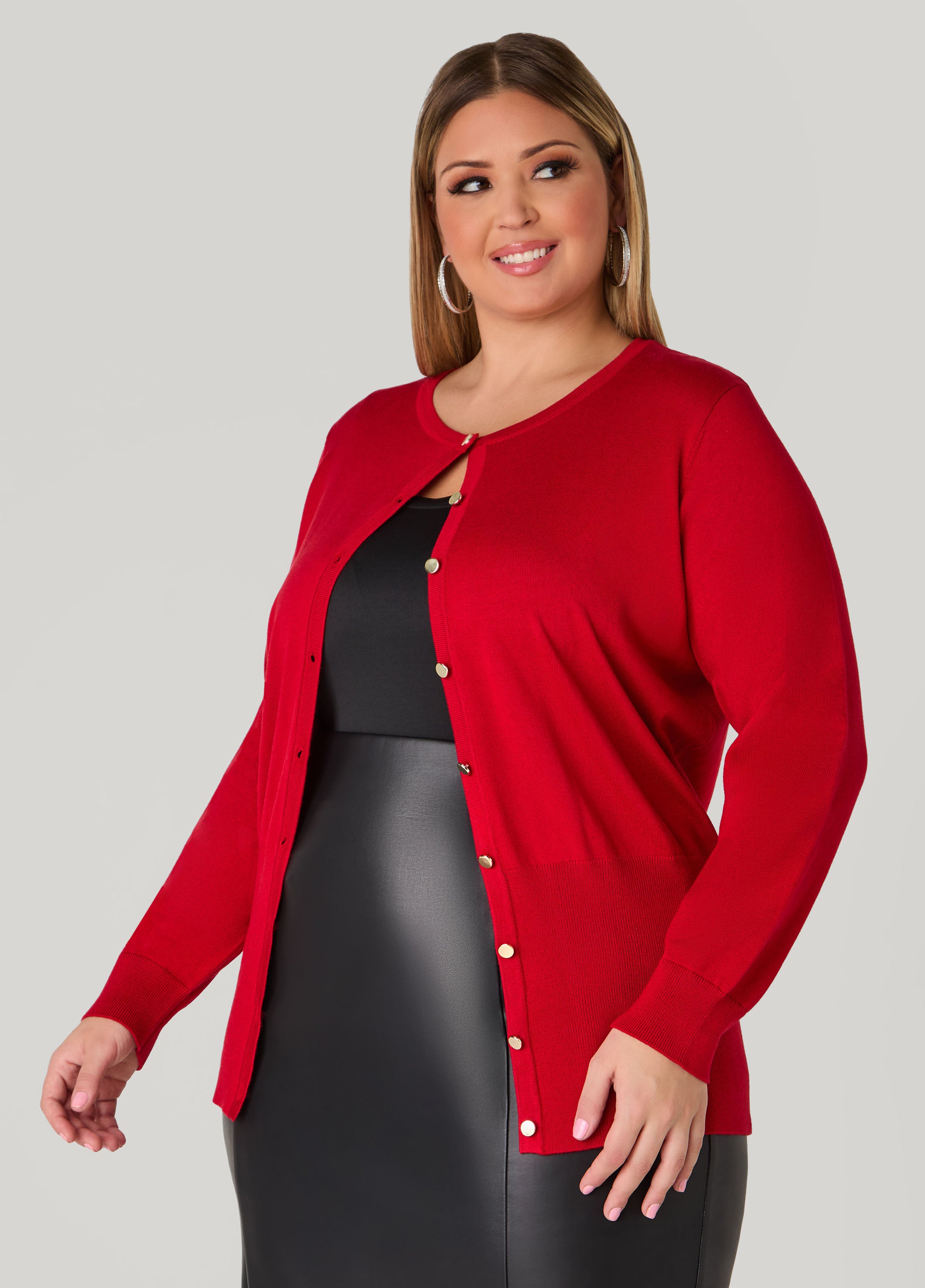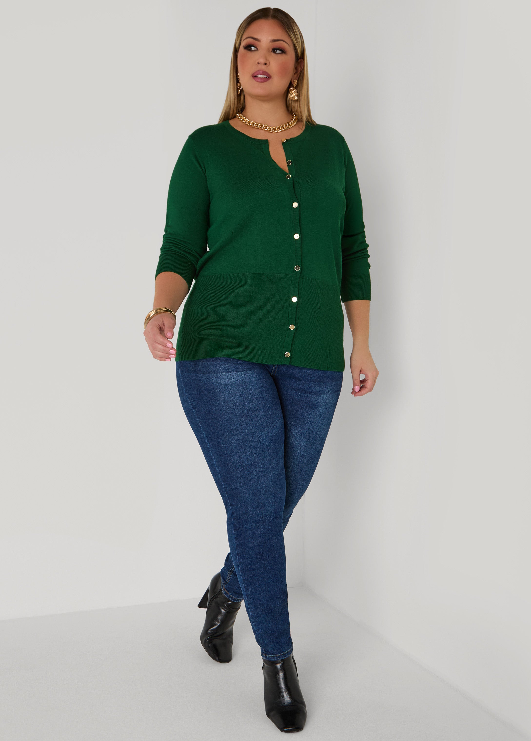 A knitted cardigan with gold button fastenings through the front, ready to pull your whole look together. Just the thing to layer when you want cozy with a little glimmer of glamour.