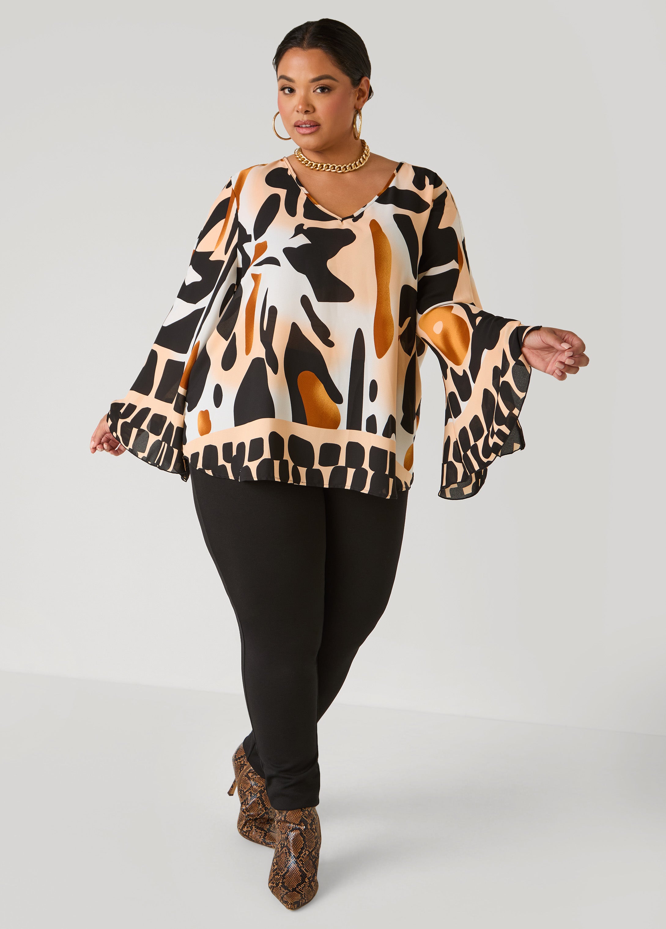 Spots of brown, black & white give this crepe blouse its standout print. A V-neckline & split bell sleeves finish the look with style in an easy slip-on style.