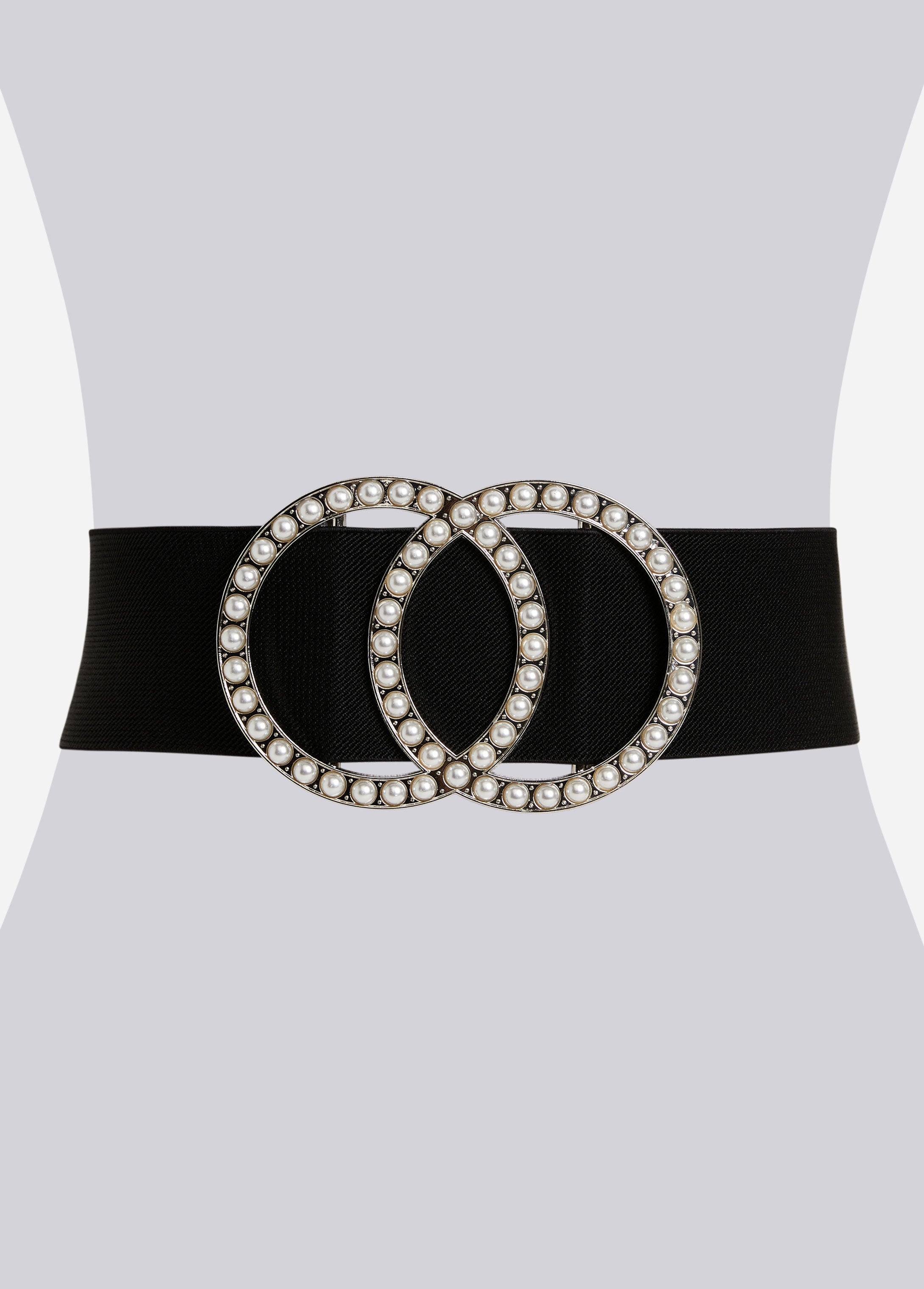 A stretchy construction ensures a waist-cinching fit on a wide, stylish belt with luxe oversize interlocking hardware showcasing luxe crystals for a touch of retro appeal.