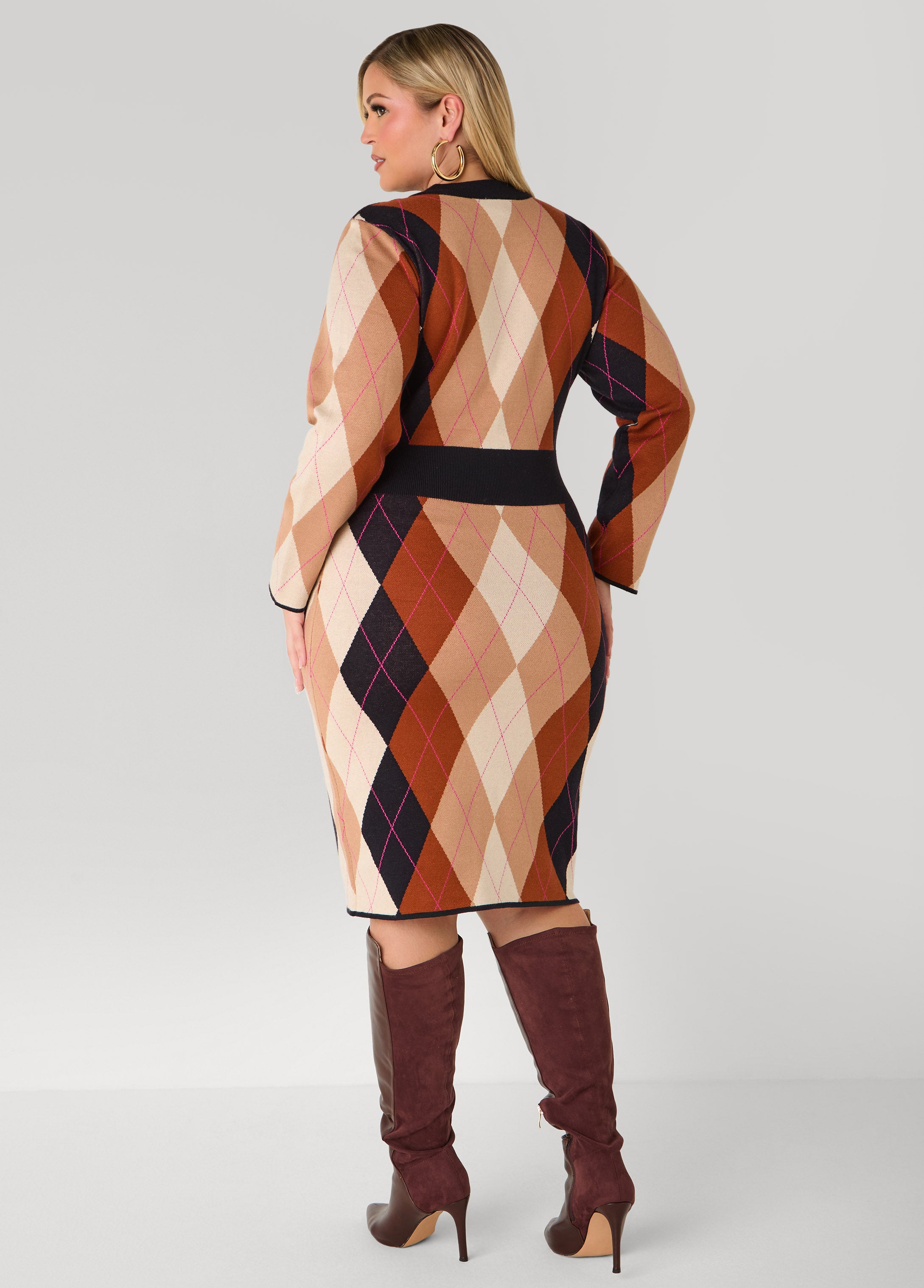 This argyle intarsia-knit sweater dress mixes classic patterning with cozy stretch for a look that’s smart, snug and ready to flirt with tradition.