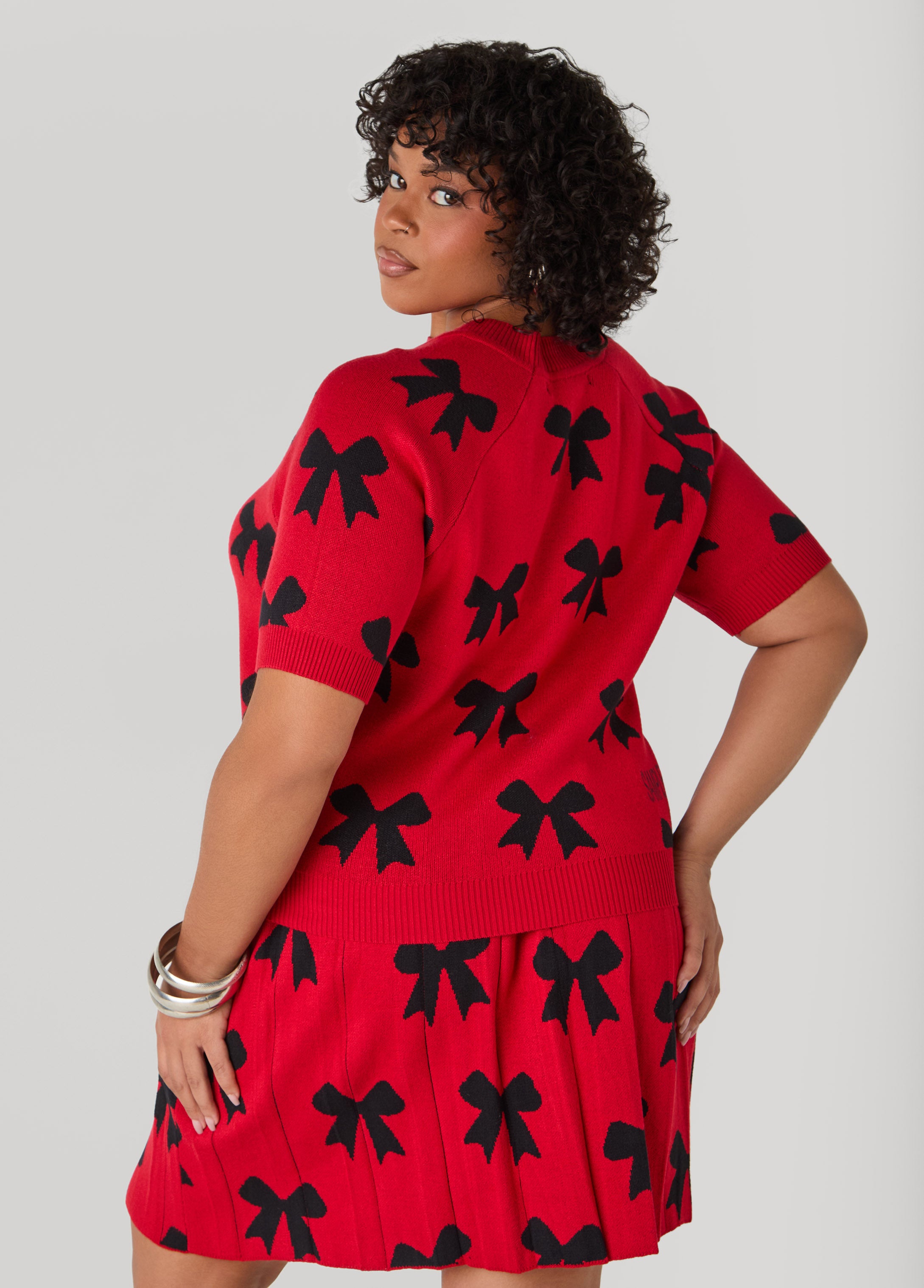 Bows gone baddie in this flirty intarsia-knit sweater with black bow motifs and turns up the charm even more when paired with the matching skirt.