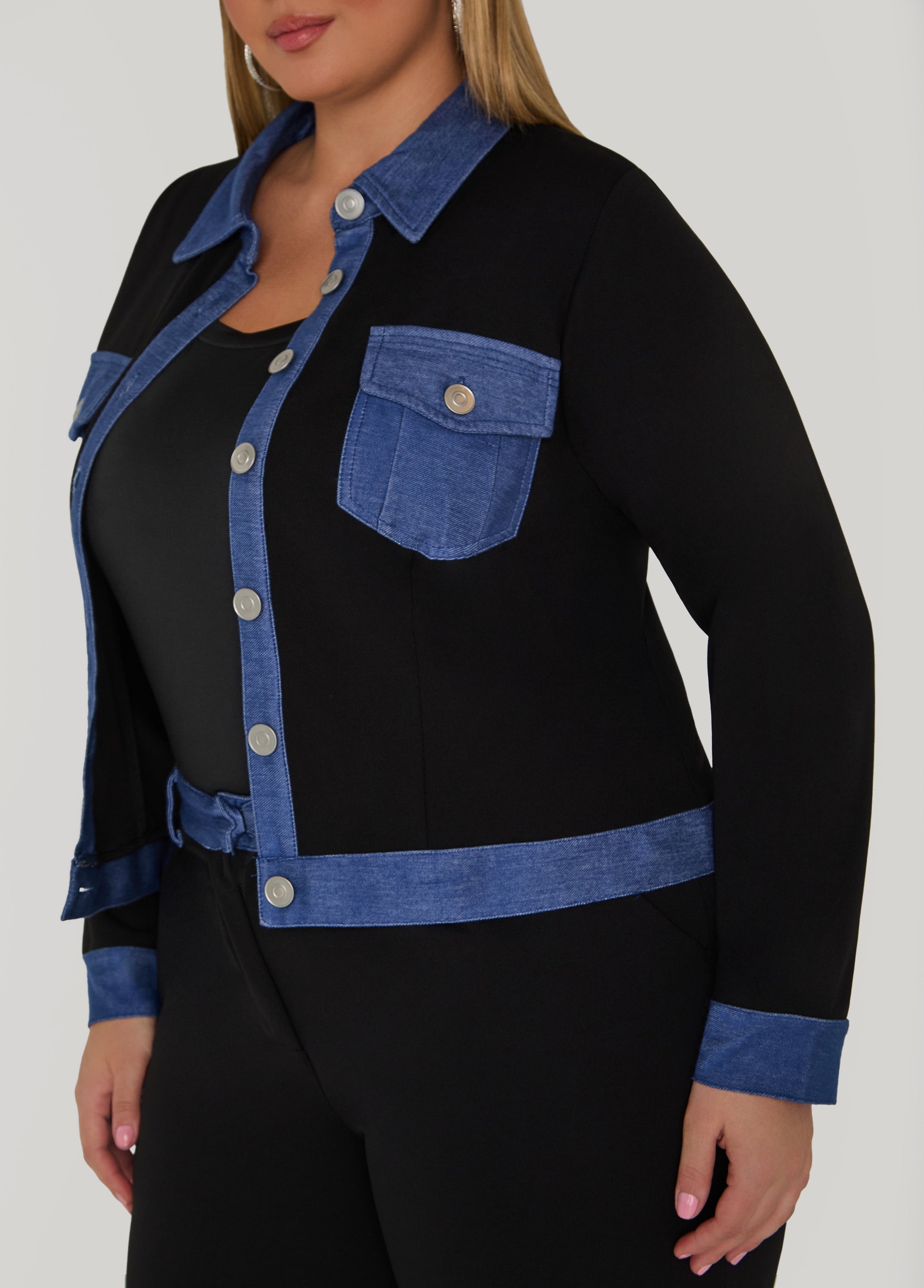 Street-smart takes on new meaning on our stretch-crepe jacket flips the script with denim panels and trims finished with flap pockets at the bust. Pair it with the matching pants for a two-piece look that’s got attitude to spare.