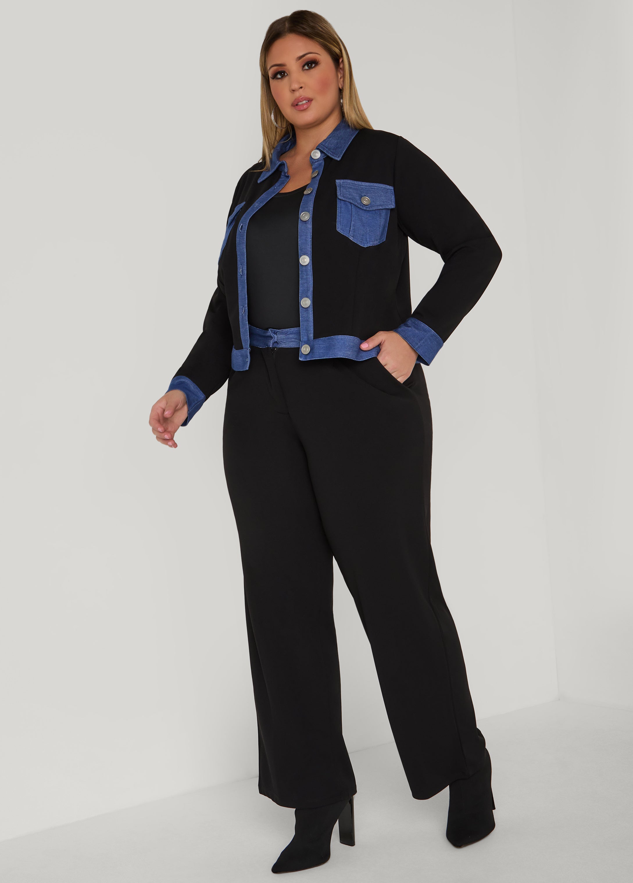 Crepe goes off-duty. These high-rise straight-leg pants bring the polish with denim panels, side pockets and a fit that owns the room. Pair with the matching jacket for a two-piece look that’s all power & also all play.
