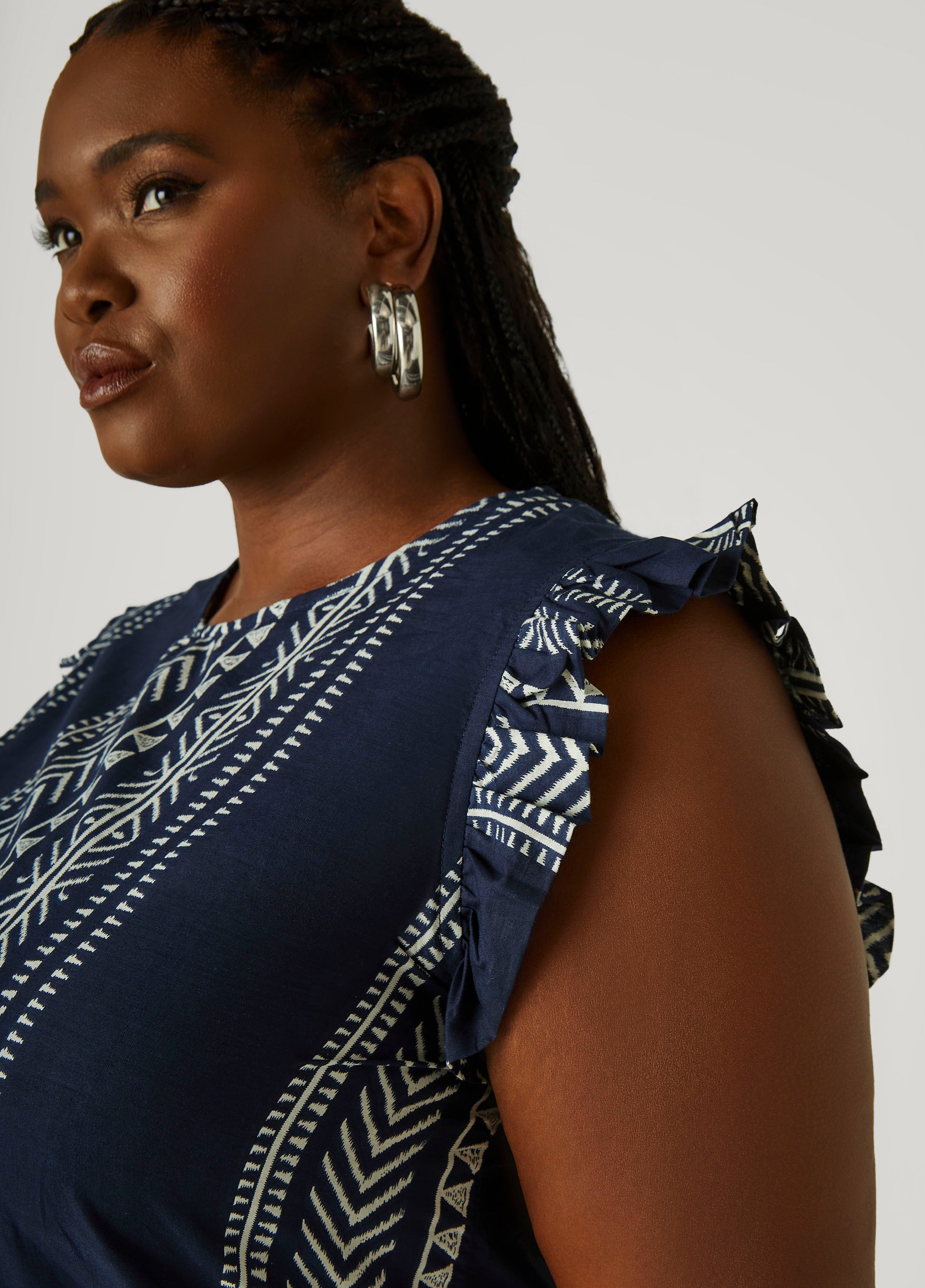 This printed cotton top is ready for fun with ruffled trims that know how to make an entrance. Light, comfy and full of personality, it's the kind of piece that shows up and shows out.
