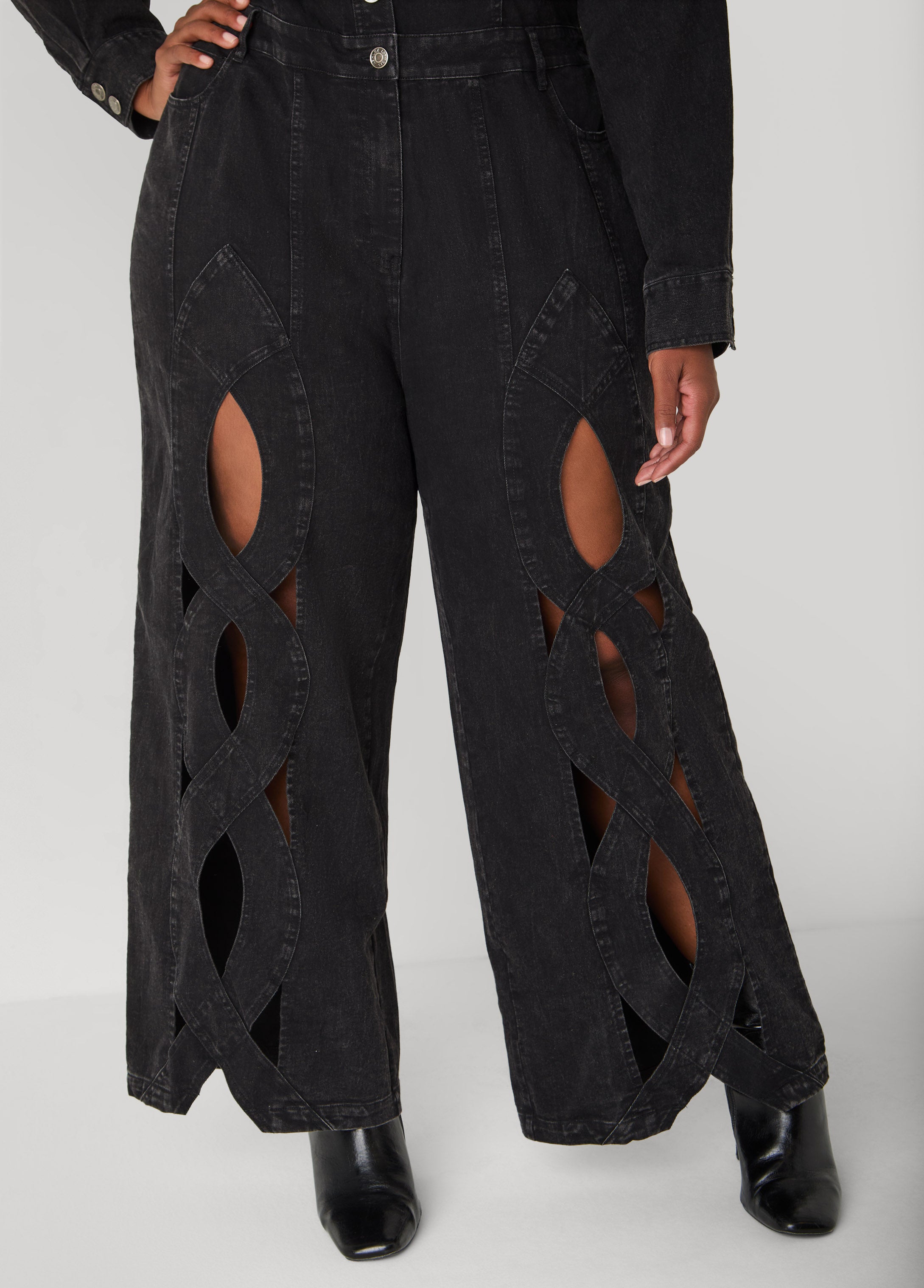 This denim wide-leg jumpsuit sizzles with front cutouts and a crisscross detail.