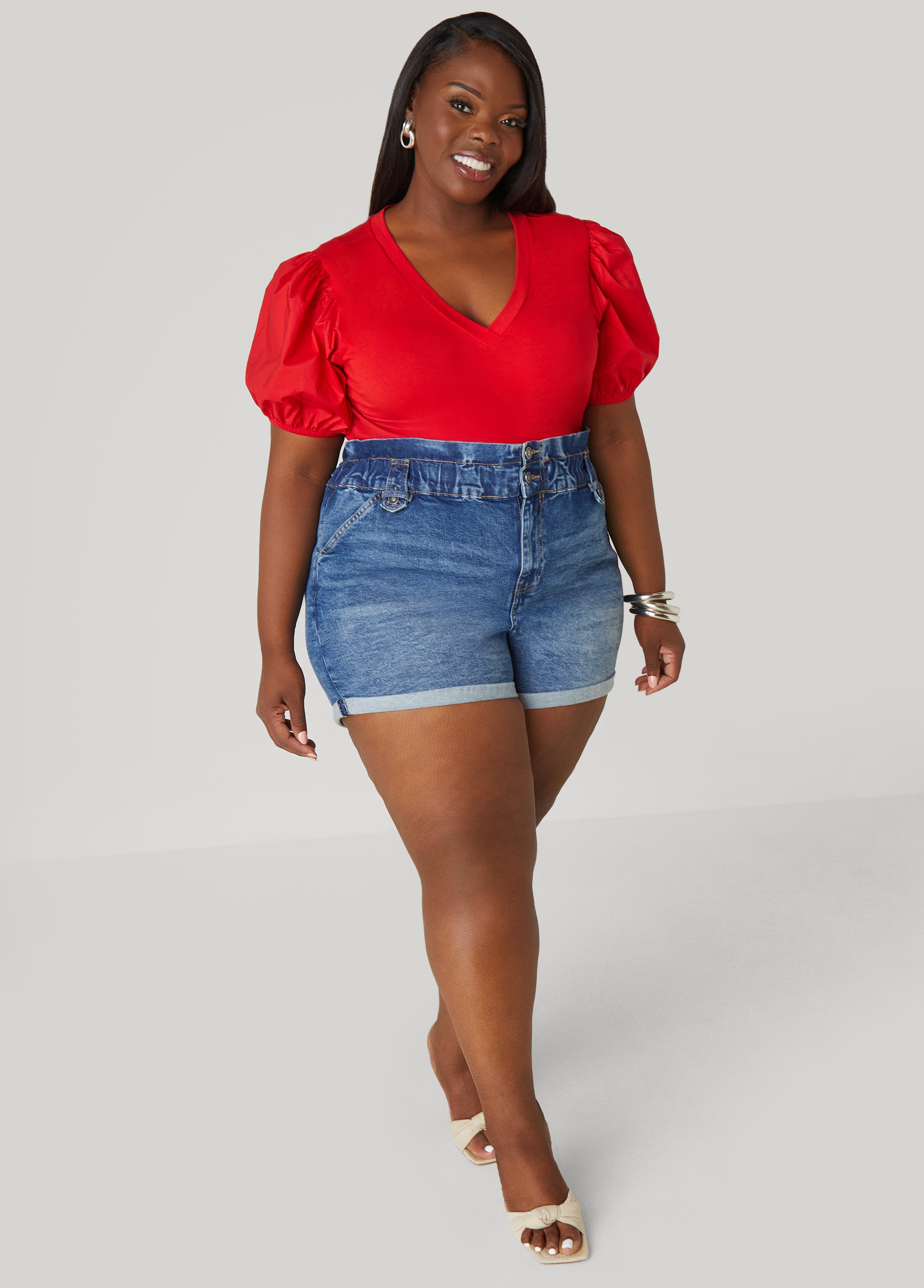 Cute, comfy and ready for warm days. These high-rise stretch-denim paperbag shorts feature a gathered waistband and cuffed hems for a trendy look that slays!