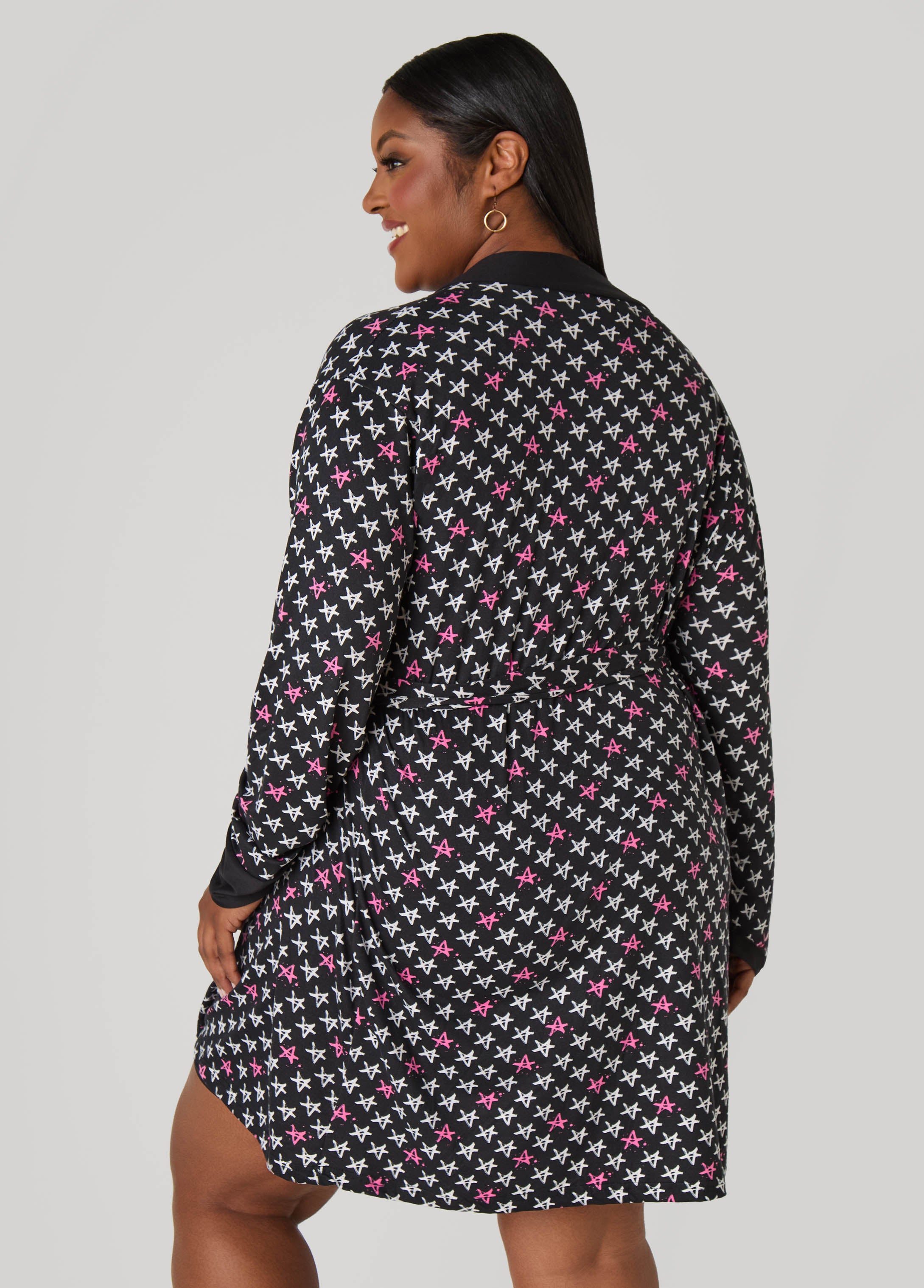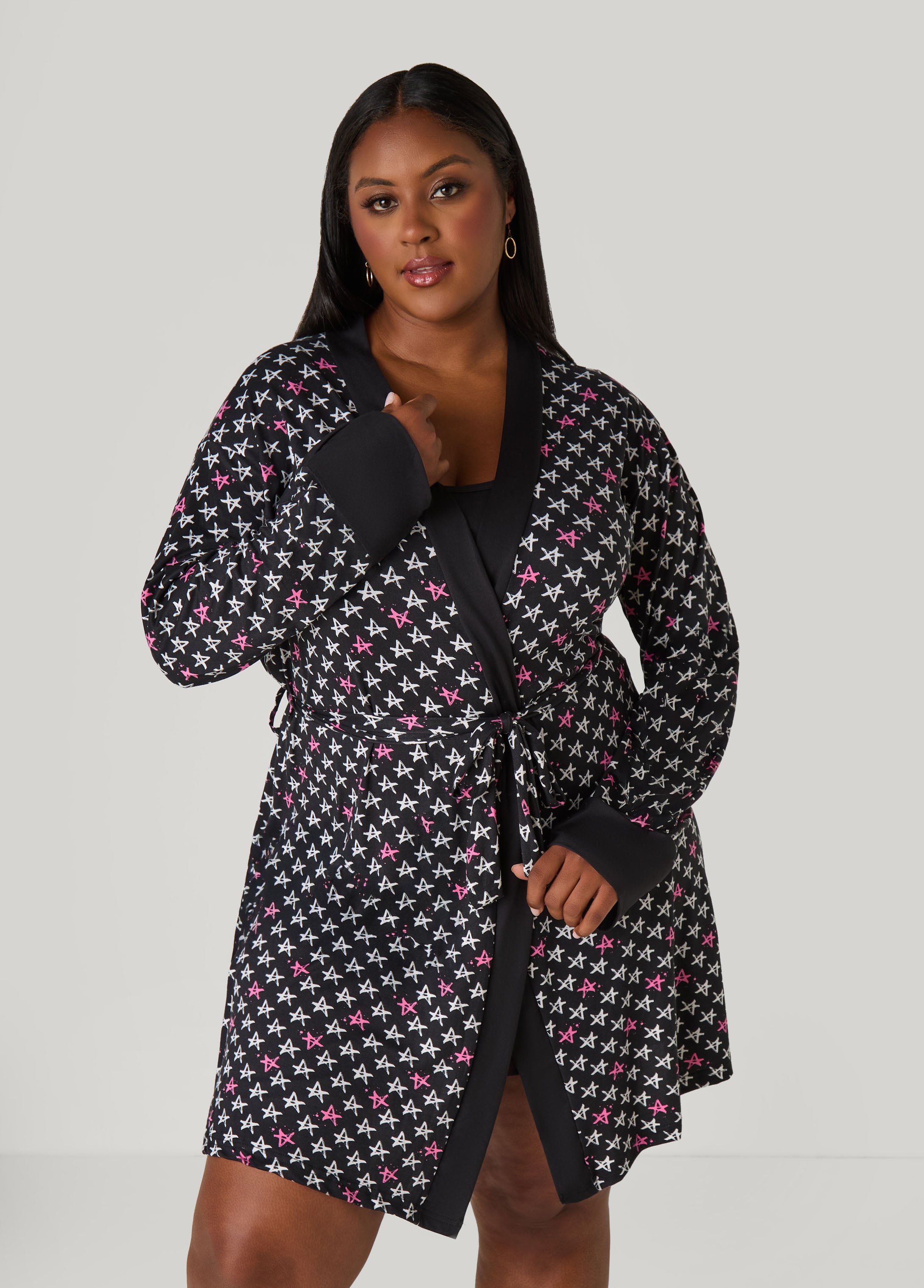 Love To Sleep gets your schedule. The jersey chemise slips on with adjustable straps and a glittered “Play All Day Sleep All Night” graphic. A printed robe with sash ties finishes the set for a look that’s cute, cozy, and totally you.