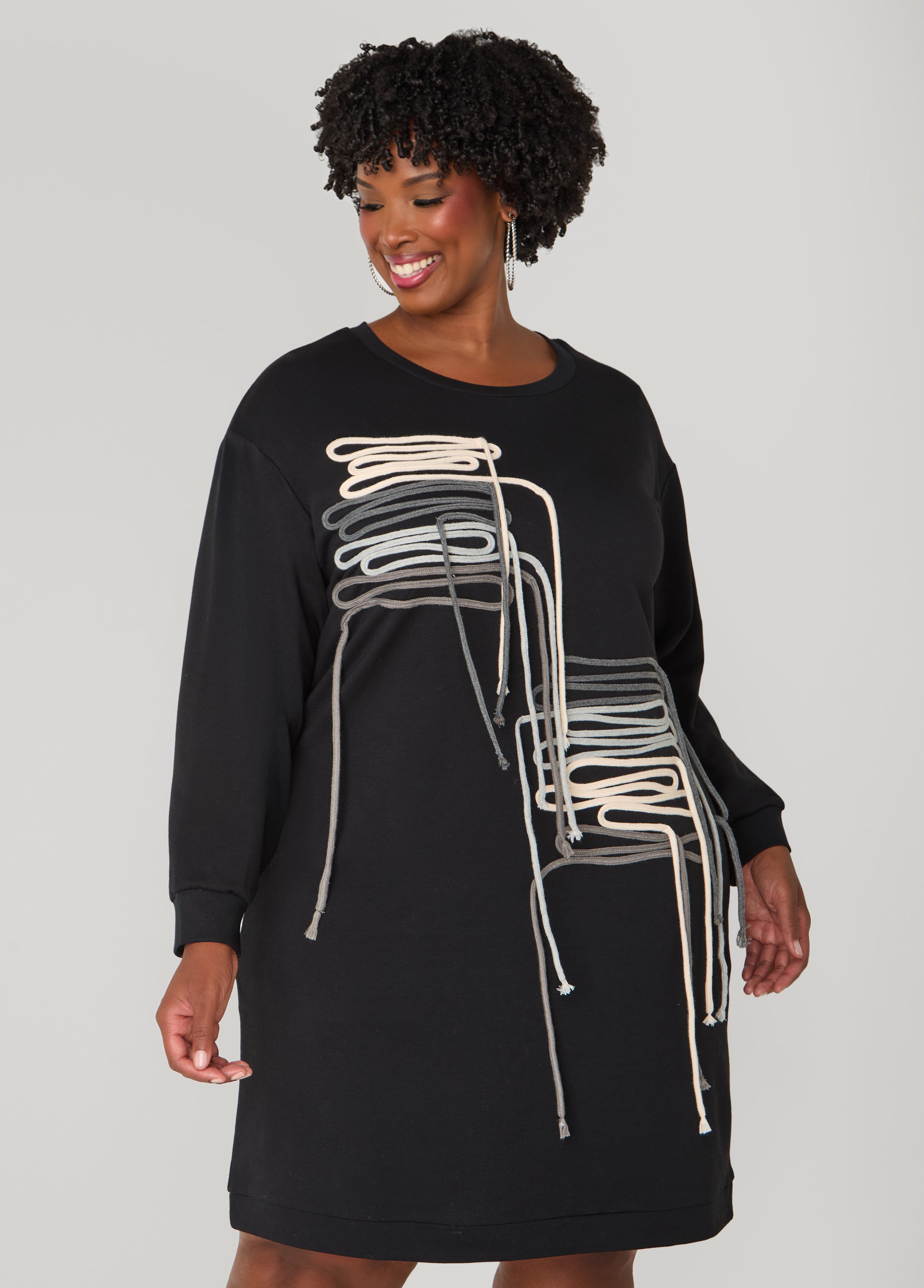 This French terry sweatshirt dress plays by its own rules. Shoelace fringe dance to the beat of your drum turning laid-back comfort into a full-on party.