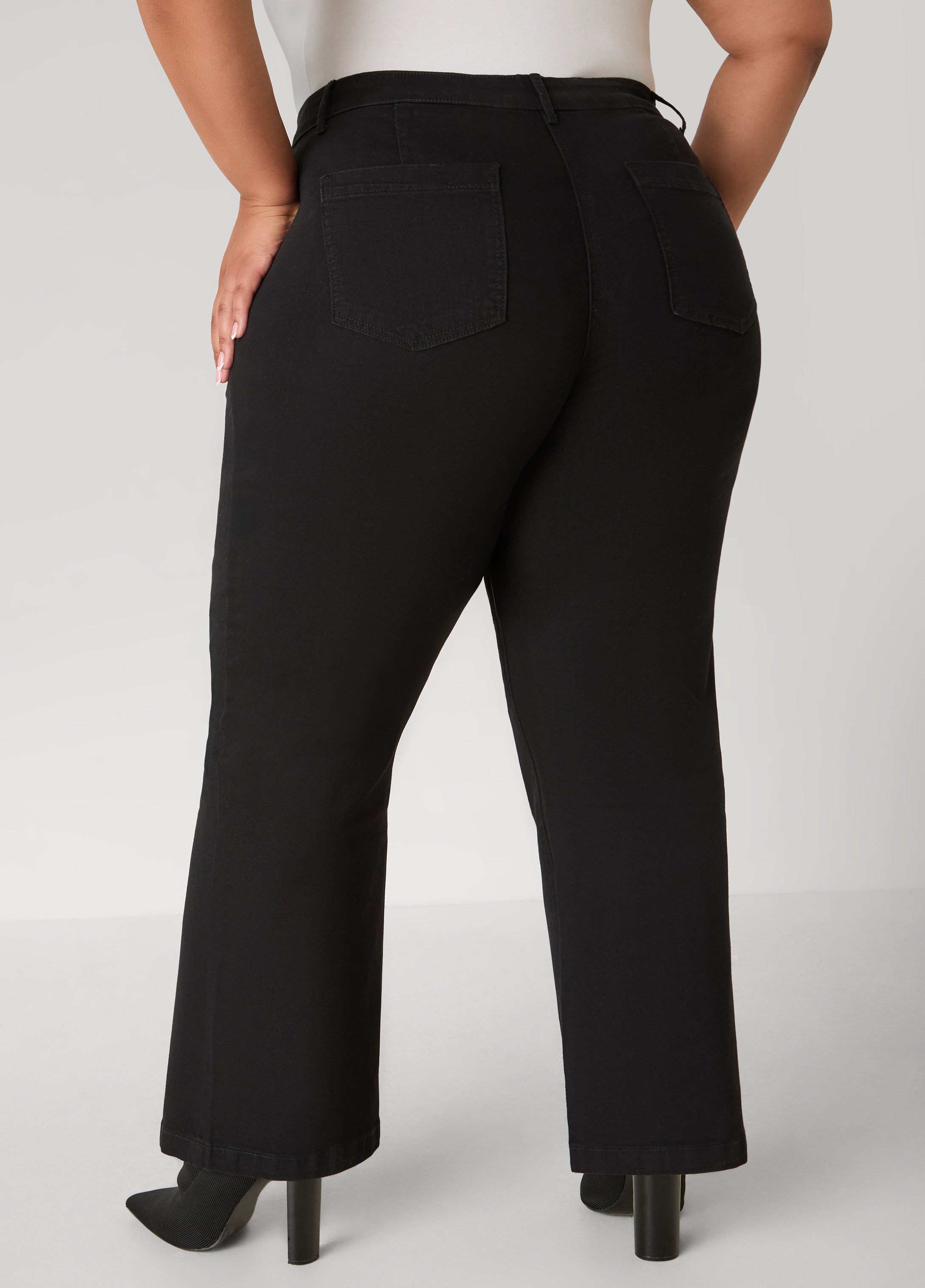 We put that thang down, flipped it & reversed it on these flared jeans!!! Patch pockets decorate the front of the stretch-denim intriguing onlookers with whether you're coming or going but confirming from any angle, your style is undeniable!