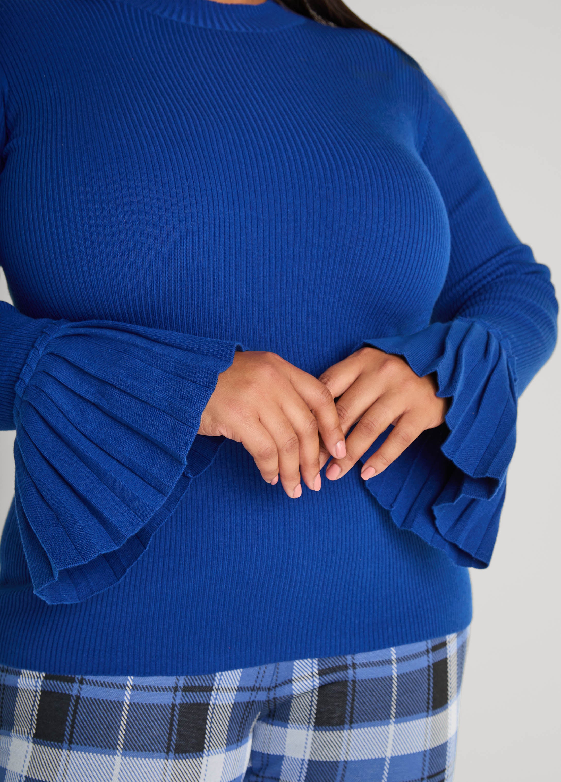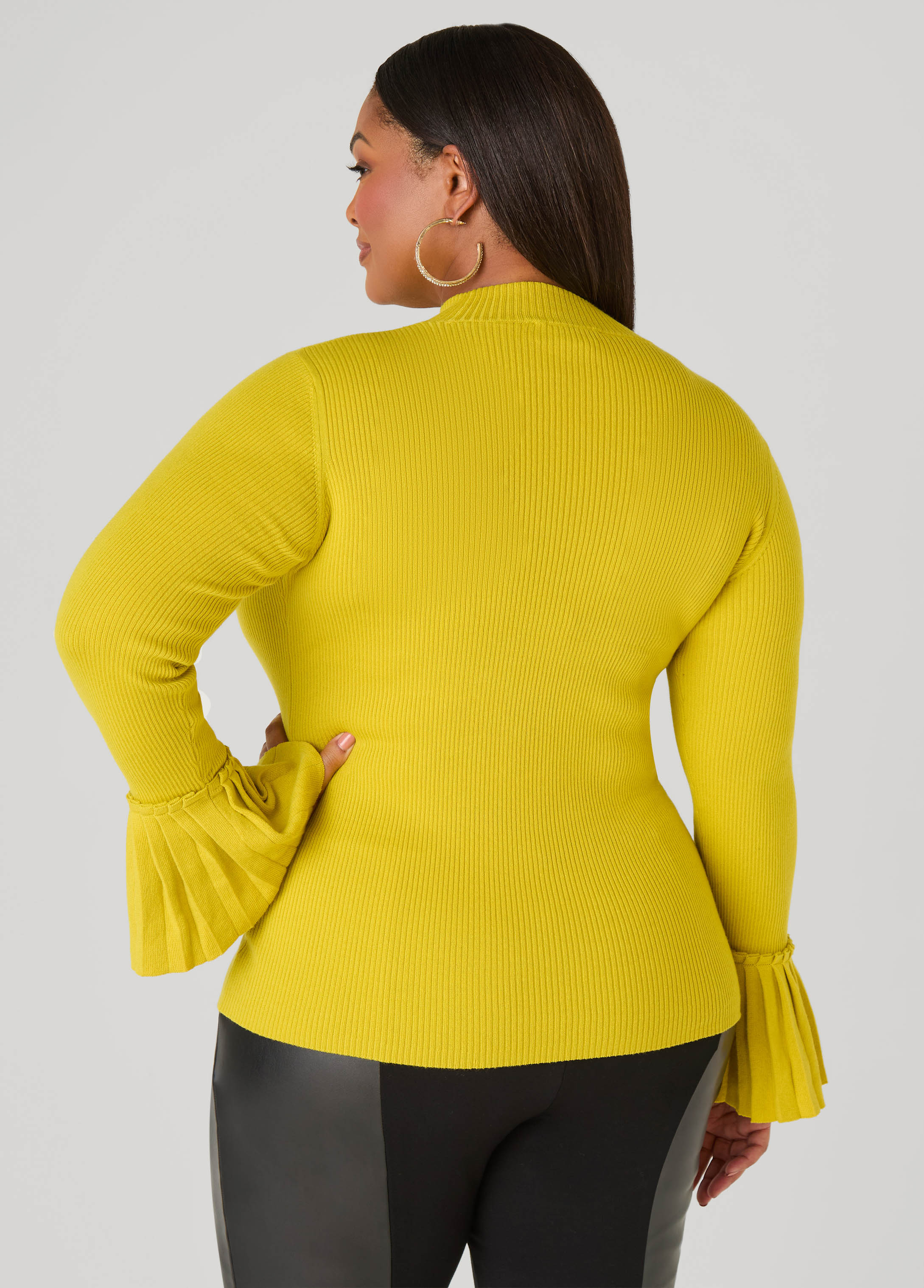 Make your everyday an every slay in our ribbed-knit sweater designed with statement-making pleated bell sleeves. This sweater is perfect for pairing with your favorite jeans or sleek skirts.