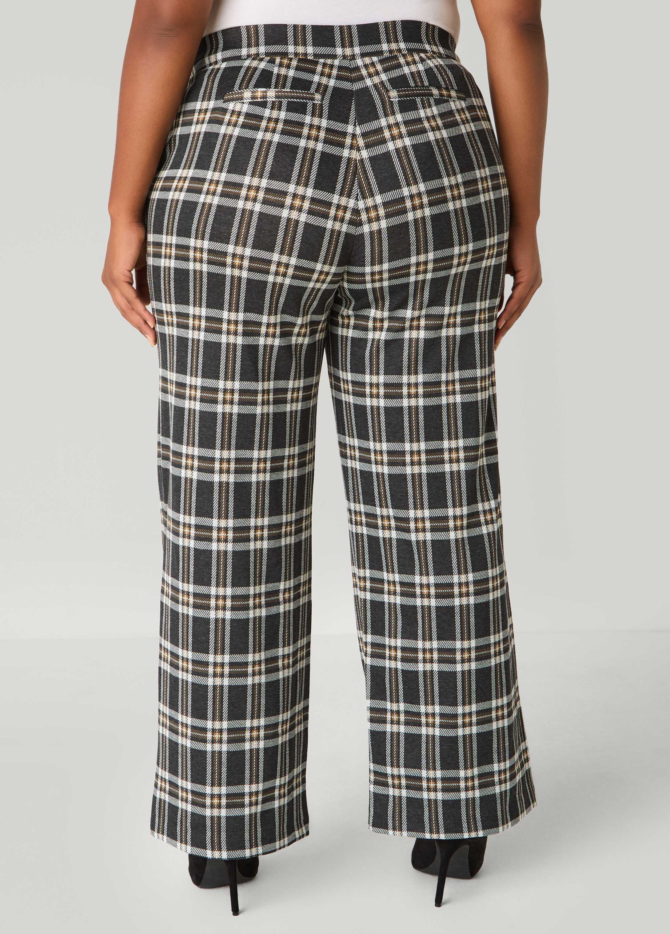 Mid-rise plaid stretch-knit wide-leg pants flare with movement, the elasticized waistband shapes the fit and slant pockets keep it functional.