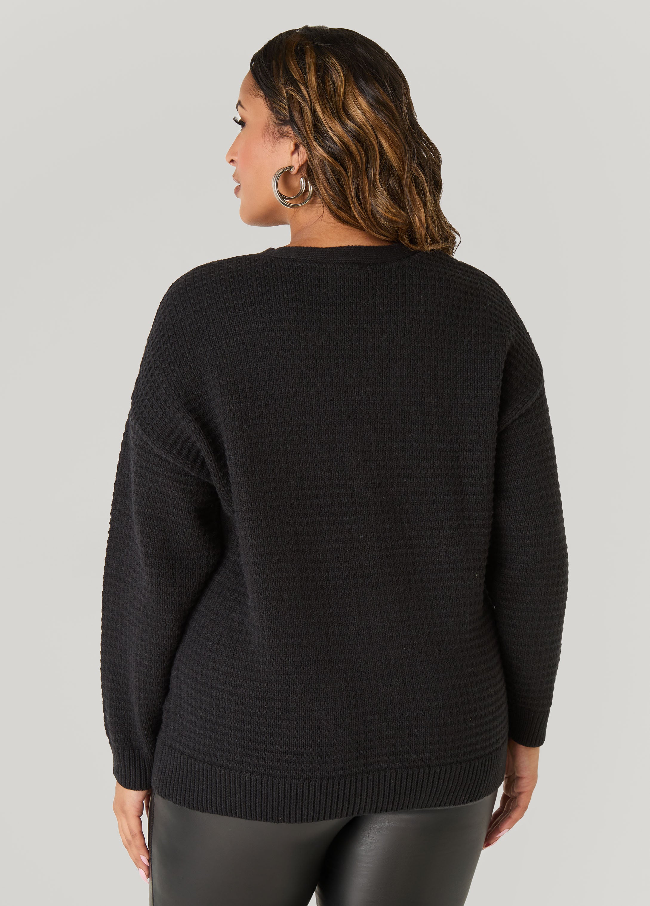 This ribbed-knit cardigan pairs a black silhouette with white rosette accents. The floral detail adds a hint of whimsy to the oversized fit.