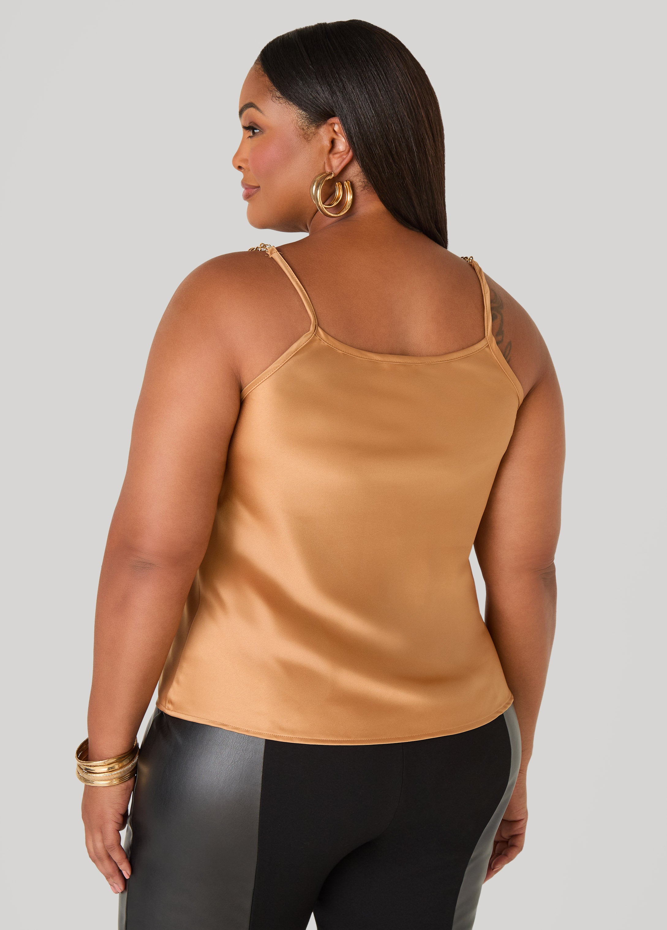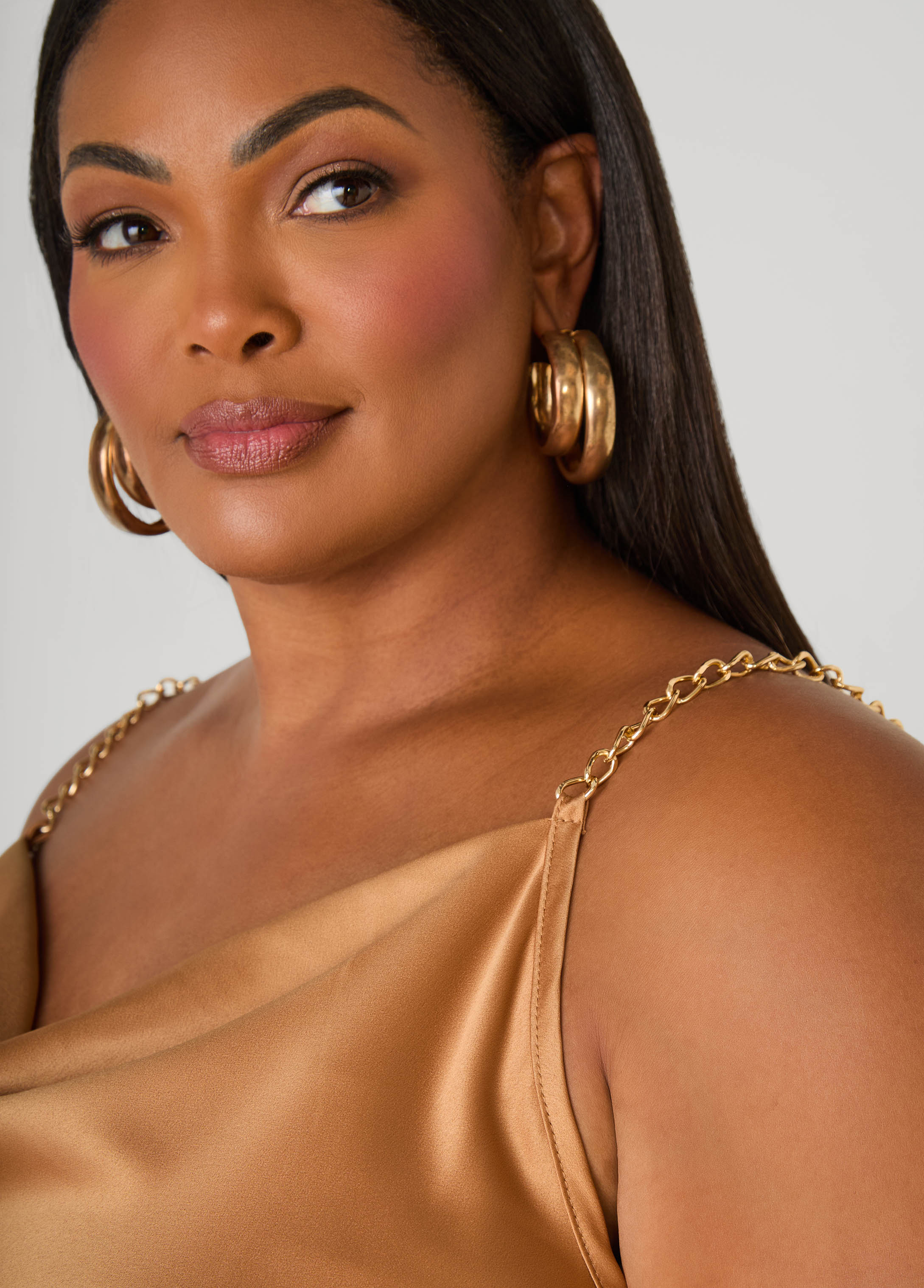 Slide into satin with a sultry cowl neckline and gold-tone chain straps that gleam against your skin. Slip it on with the matching kimono for a head-turning duo.