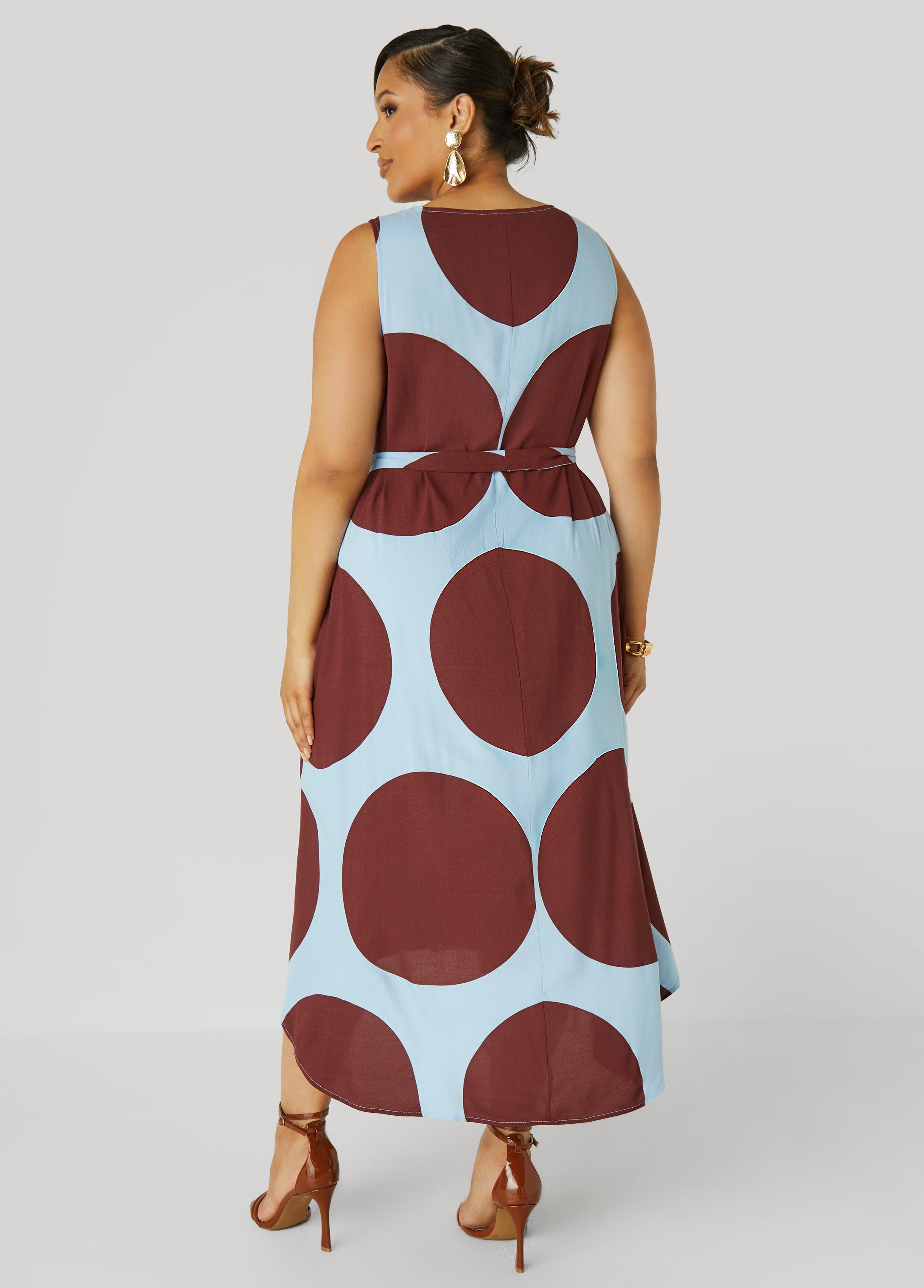 Dot your day with something fun. This woven midi serves up classic polka dots with a V-neckline, waist ties and a dipped back hem for a little extra sway. Side pockets keep it practical so you're set from lunch plans to sunset strolls.