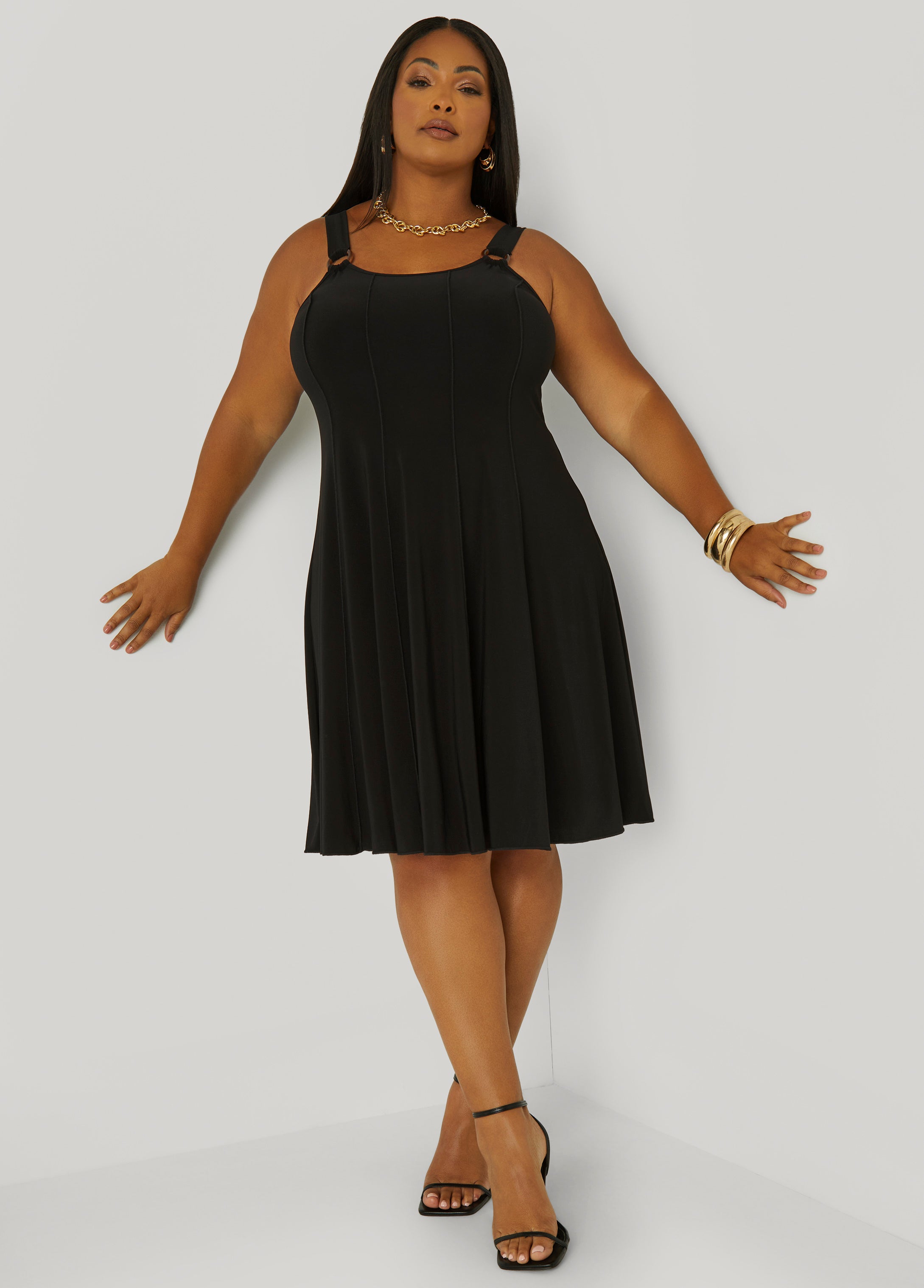This stretch-knit swing dress keeps it fun with ring accents and seam details that know how to stand out. Finished with an A-line hem that brings the swish, it’s your go-to for plans that call for a little extra.