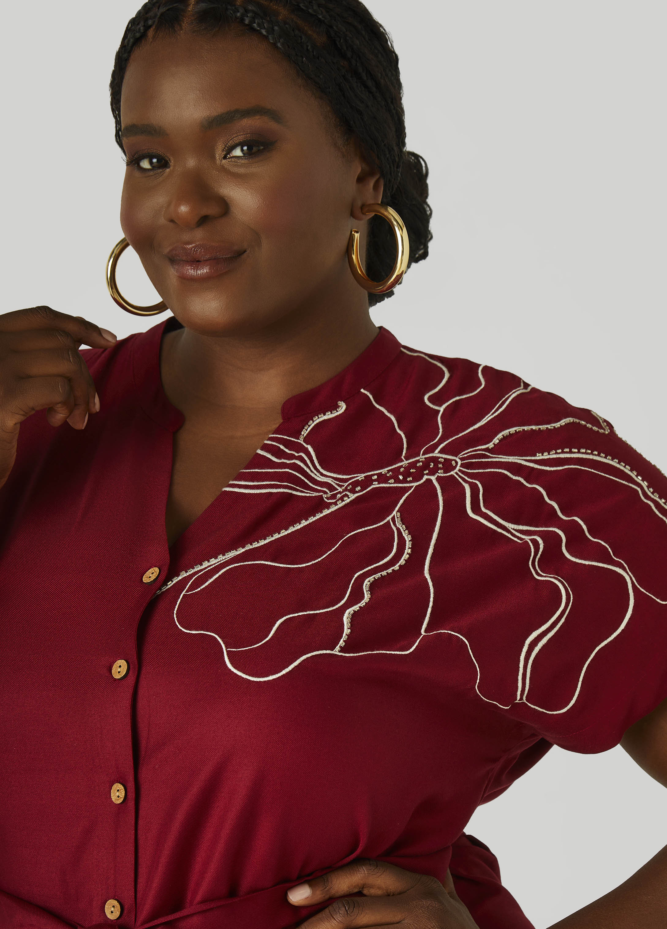This twill midi’s got that buttoned-up energy with a wild side. Floral embroidery and bead sparkle bring the fun, sash-ties cinch you in, and the dipped hem keeps things interesting from front to back.