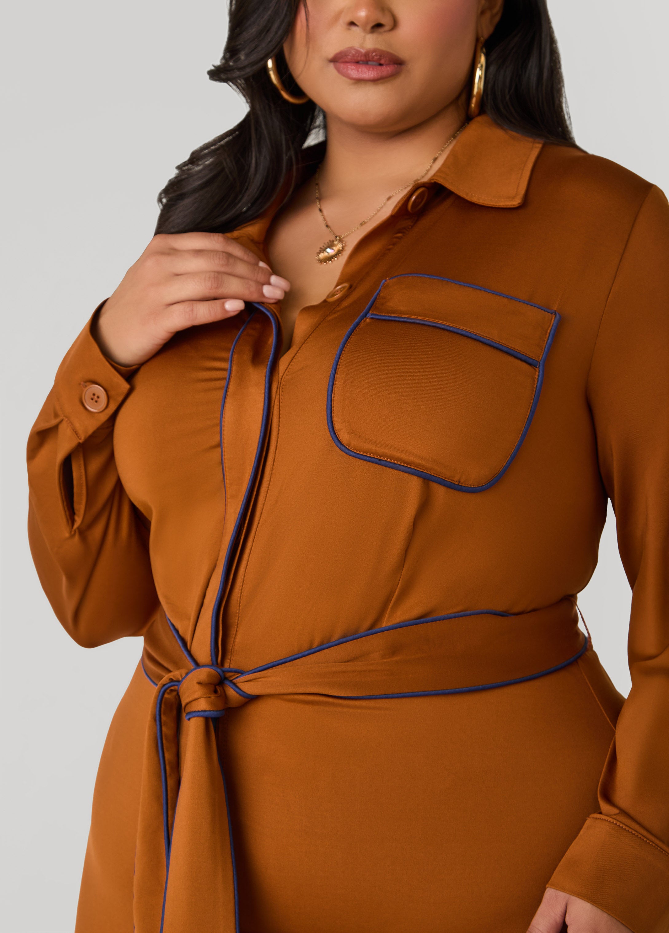Perk up your wardrobe with a caramel cafe moment. This stretch-knit shirtdress serves with a sash-tie and contrasting trims that’s all flavor & flair.