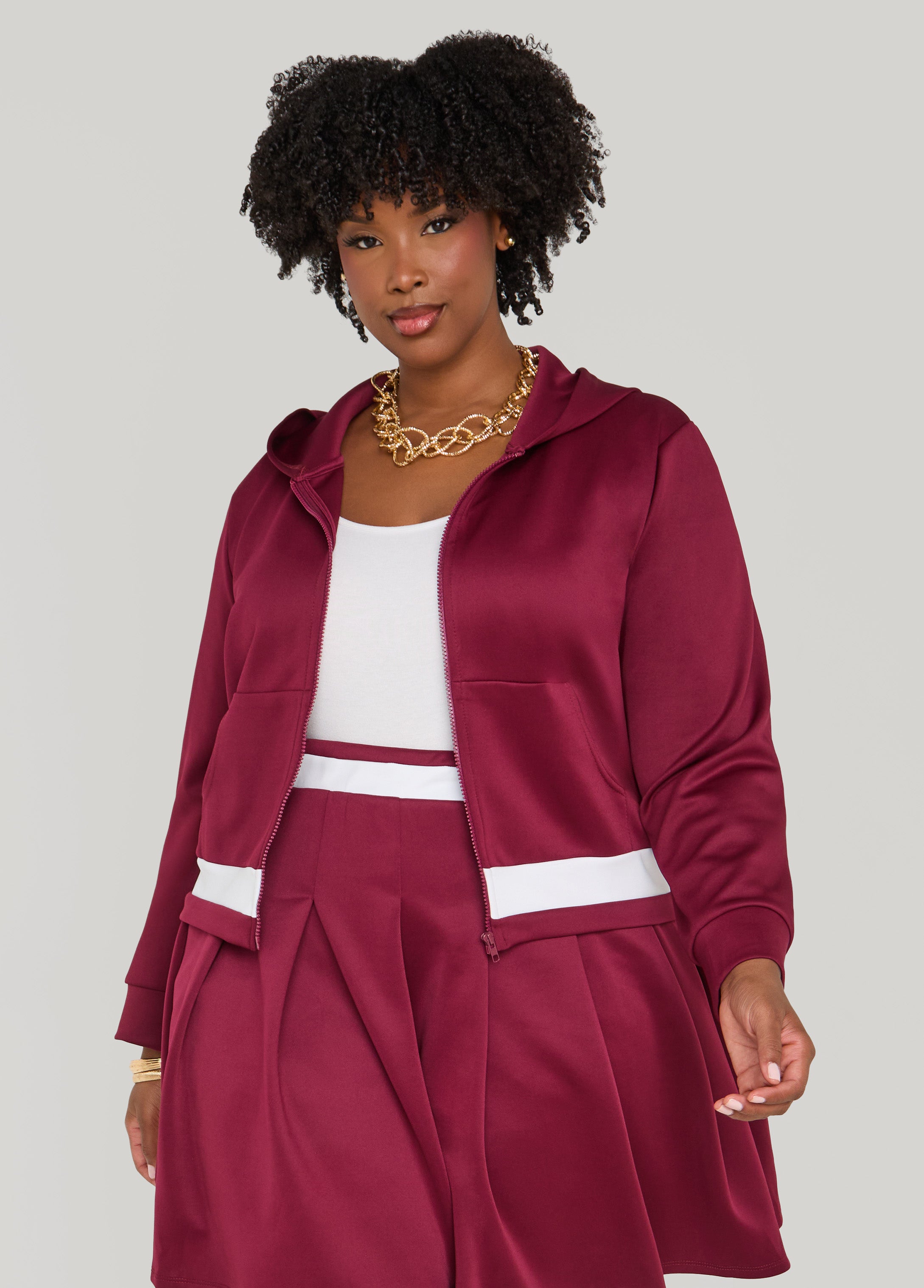 Zip it up & get ready to take on the world in our stretchy hoodie with a contrasting stripe along the trim. Make it a winning pair with the matching pleated skort.