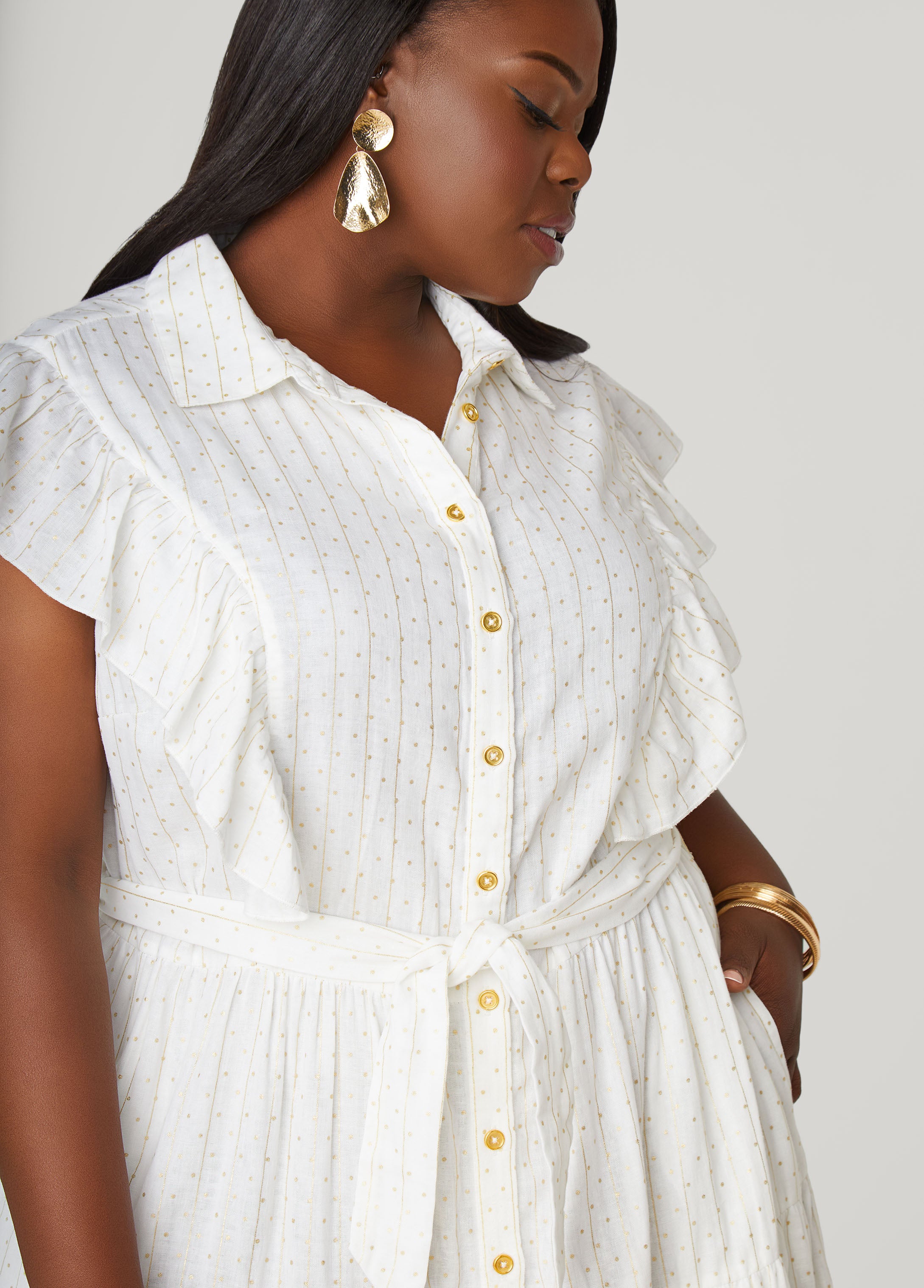 This metallic print cotton midaxi dress flirts it up with ruffled sleeves, side pockets, and a sash-tied waist made for twirling.