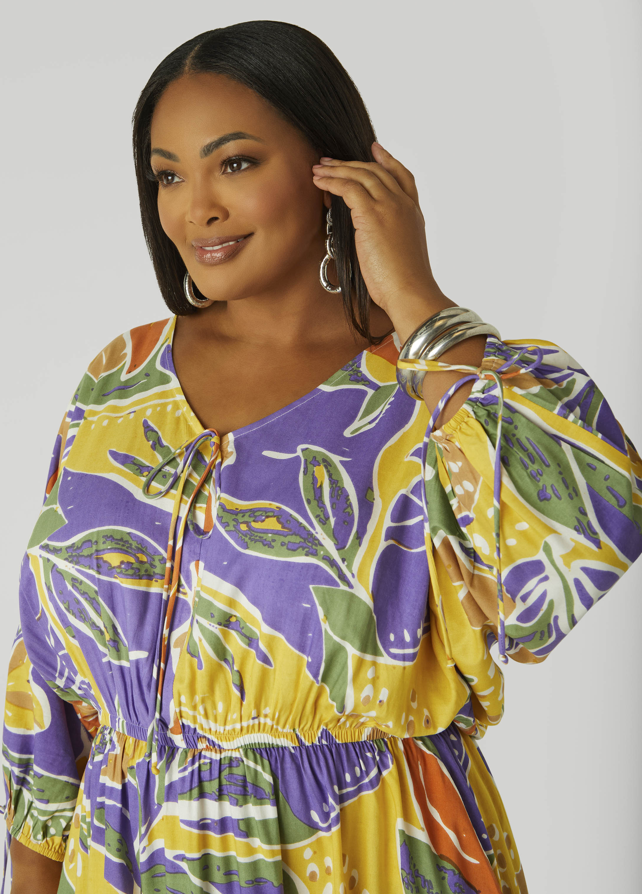 Bring the getaway vibes wherever you go in our tropical print dress keeps things fun with tie details at the sleeves and neckline, a flowy A-line skirt and an easy-fit waistband.