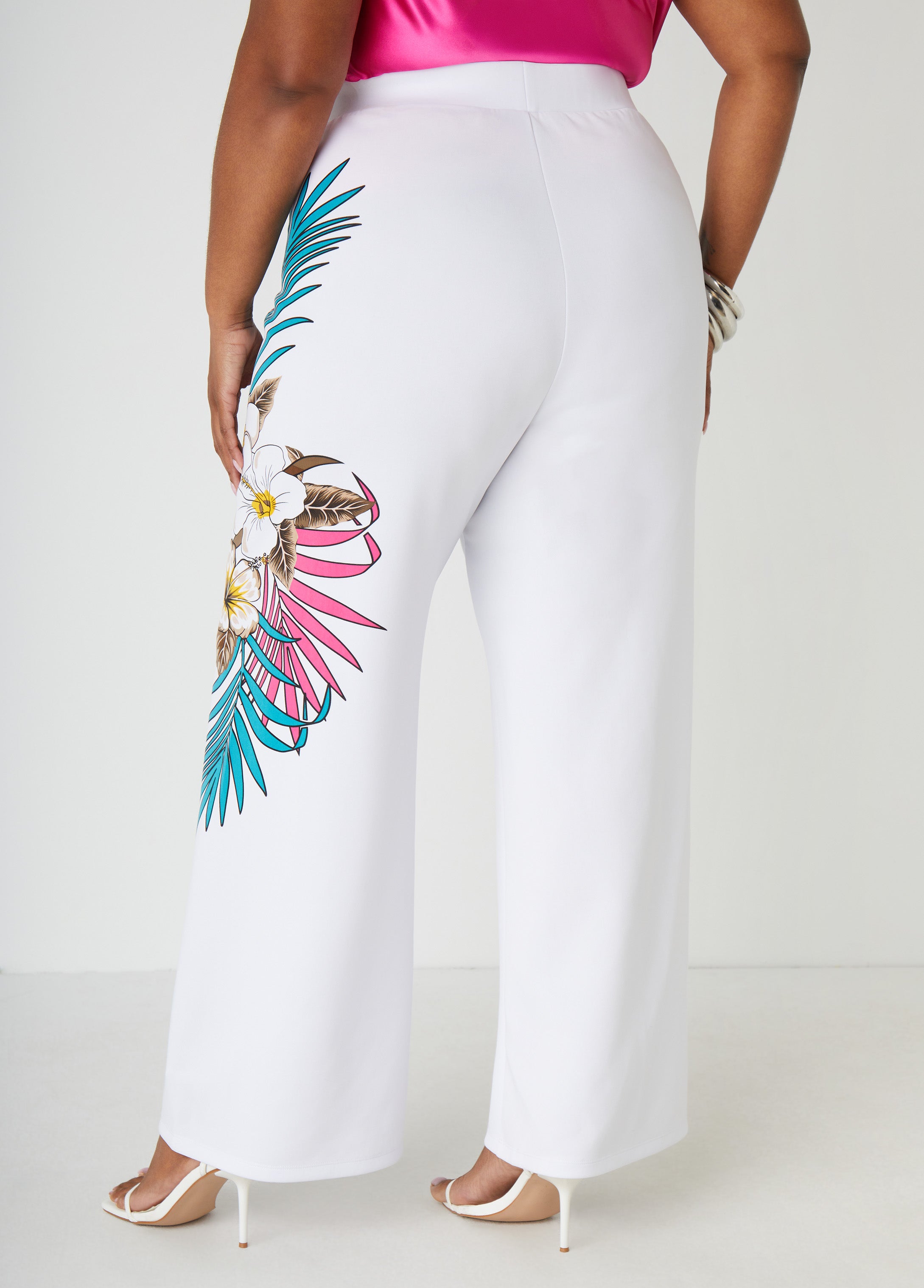 These high-rise scuba wide-leg pants bring the drama with a bold tropical print on one leg and a sleek, pull-on fit. The elasticized waistband keeps it comfy, while the statement design keeps all eyes on you.