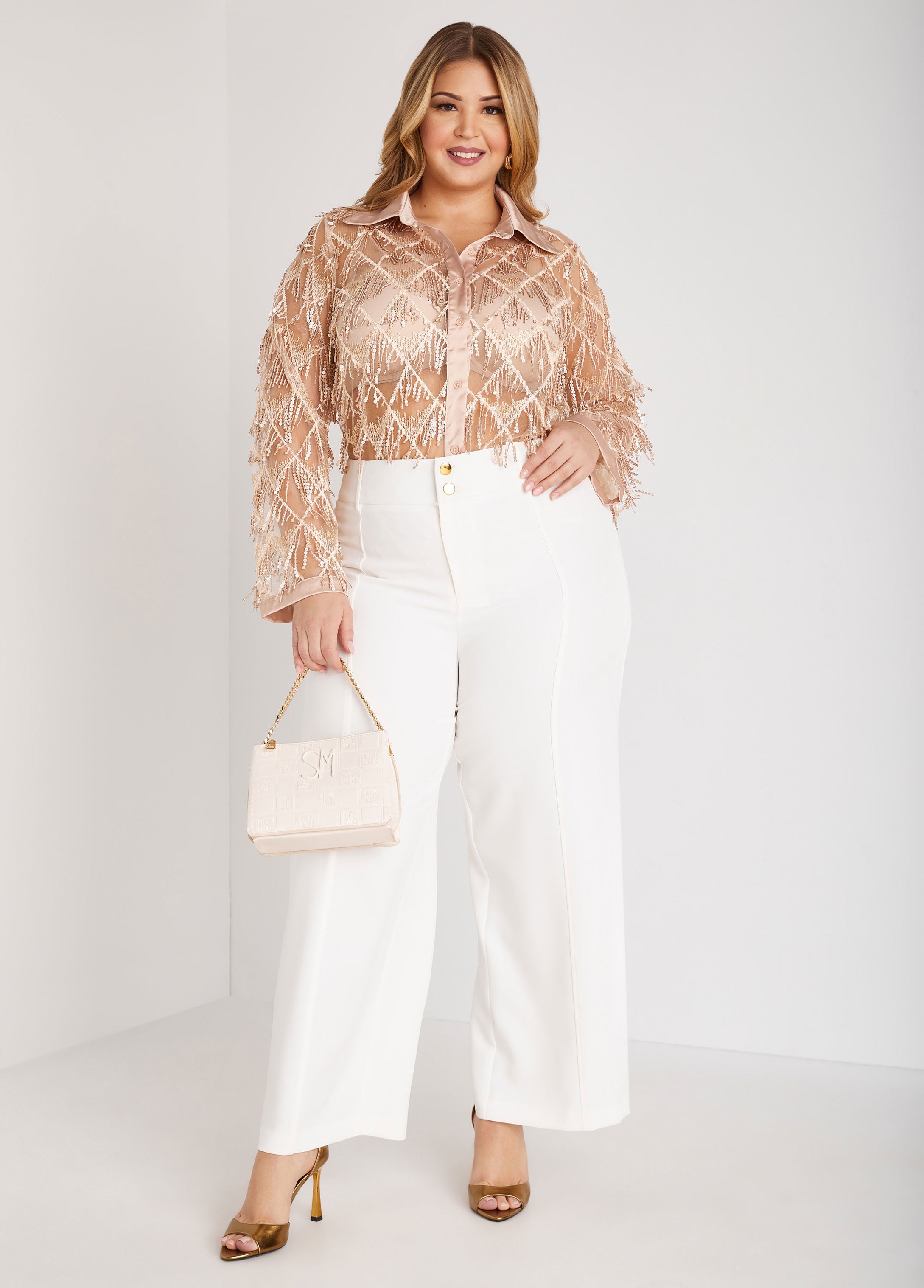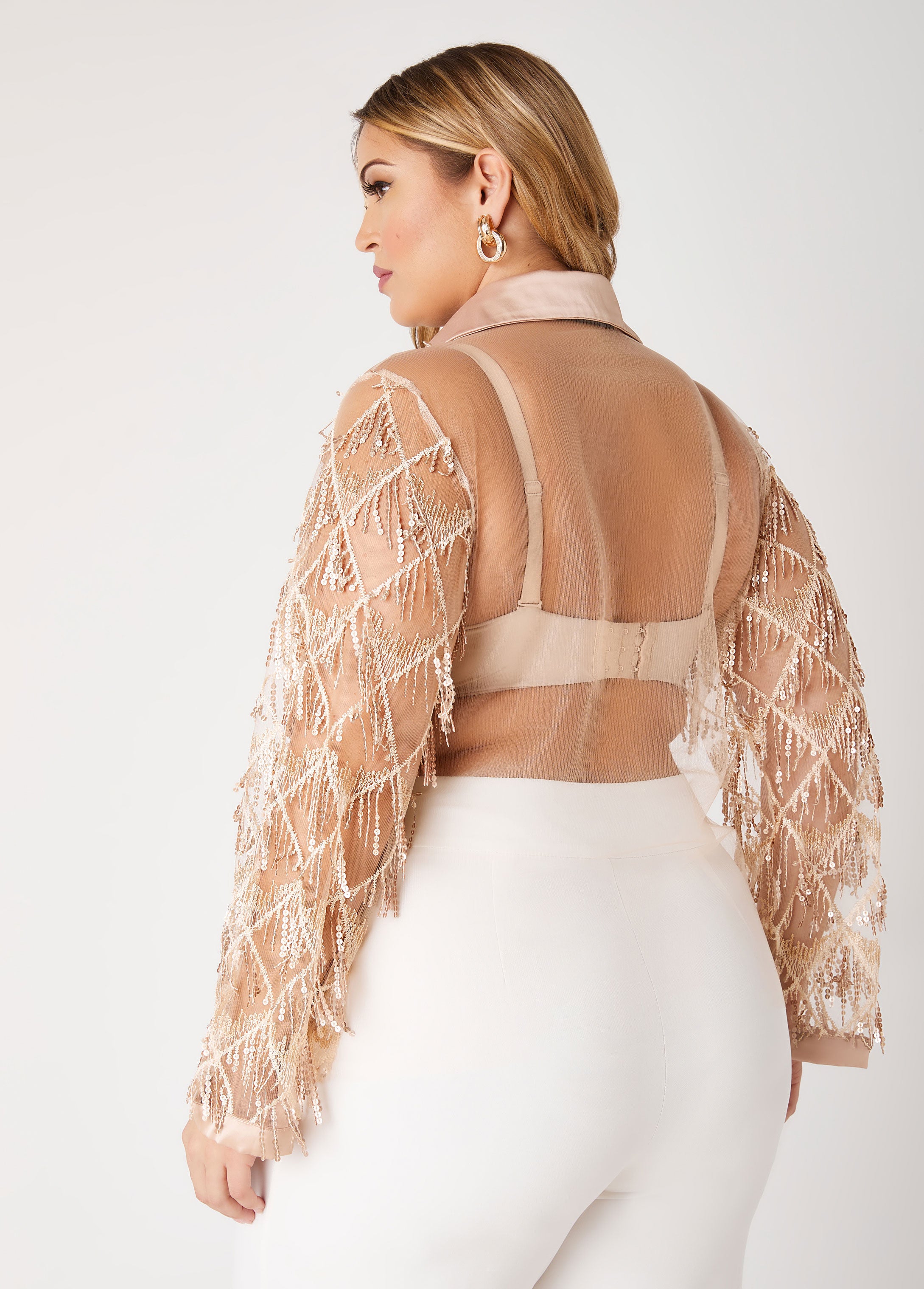 This mesh shirt is adorned with fringed sequins that catch the light with tonal metallic stitching for additional personality injected into the silhouette.