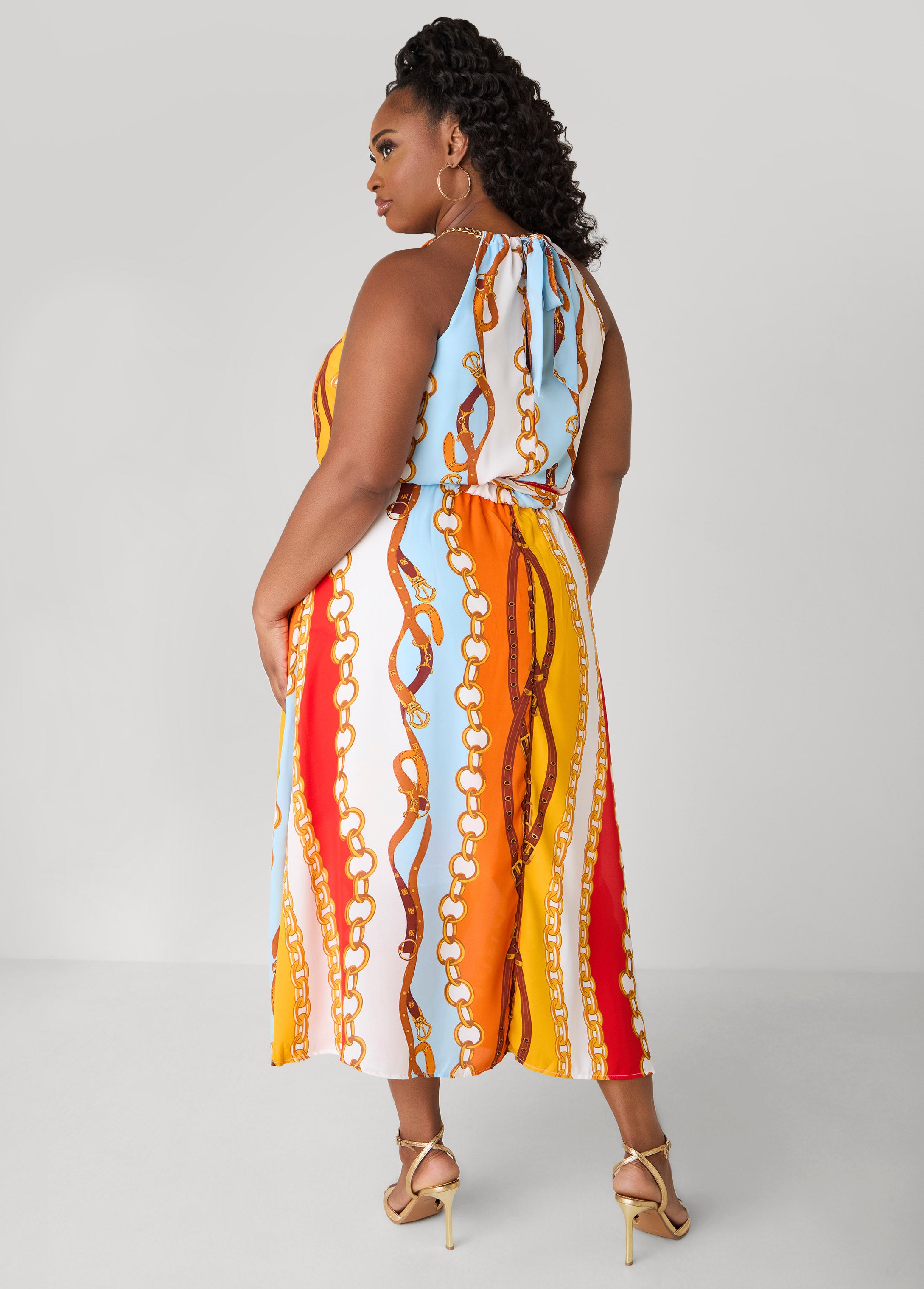• Chain print crepe maxi dress with faux wrap neckline, chain-link shoulder straps, a-line skirt and sash-ties at elasticized waistband. Fully lined in stretch-knit. Tie fastenings at cutout back. Length: 54.5in.