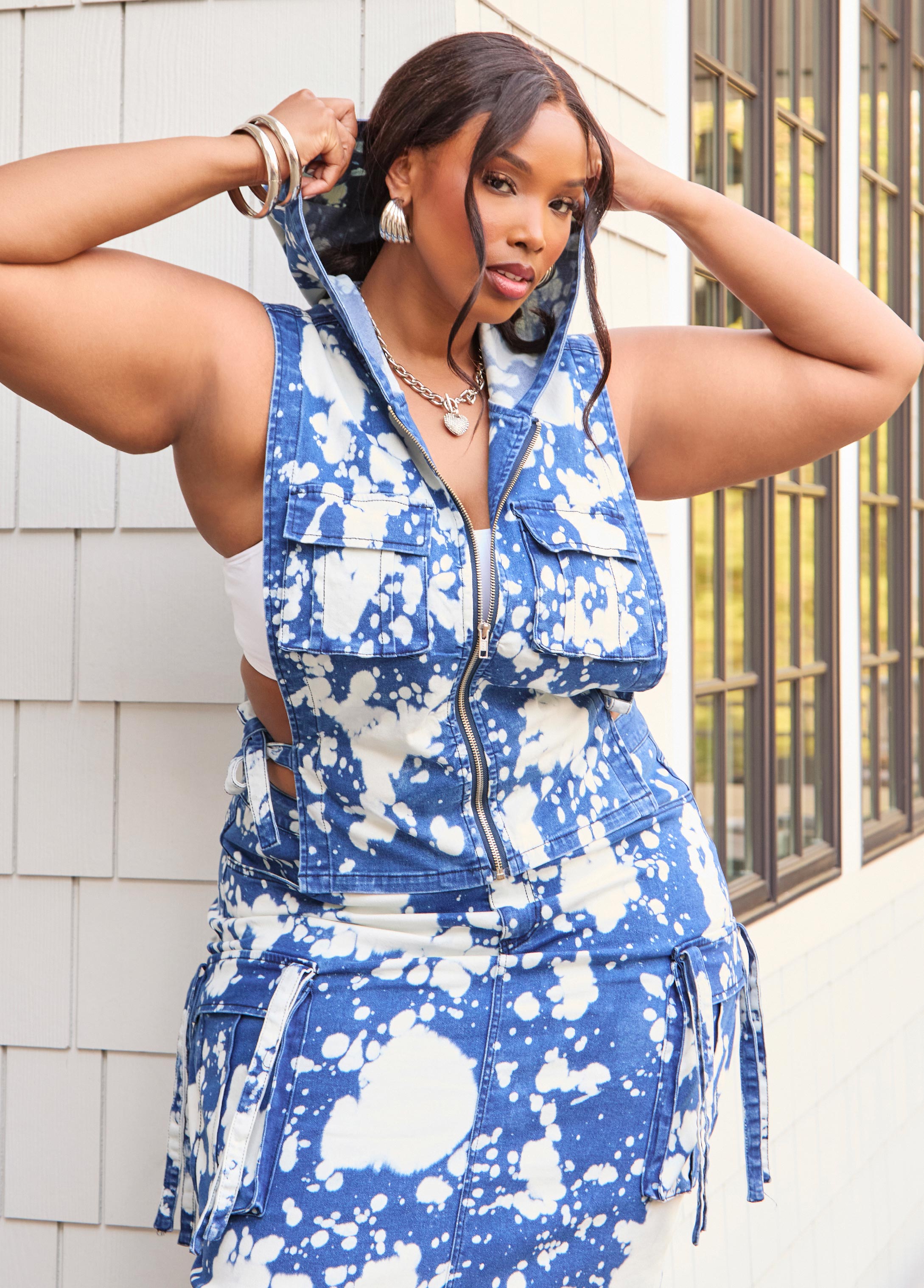 This bleached denim vest with hood and flap pockets dials up cool with adjustable tie fastenings at the open sides. Pair it with the matching skirt for a set that’s all about laid-back attitude and serious style.