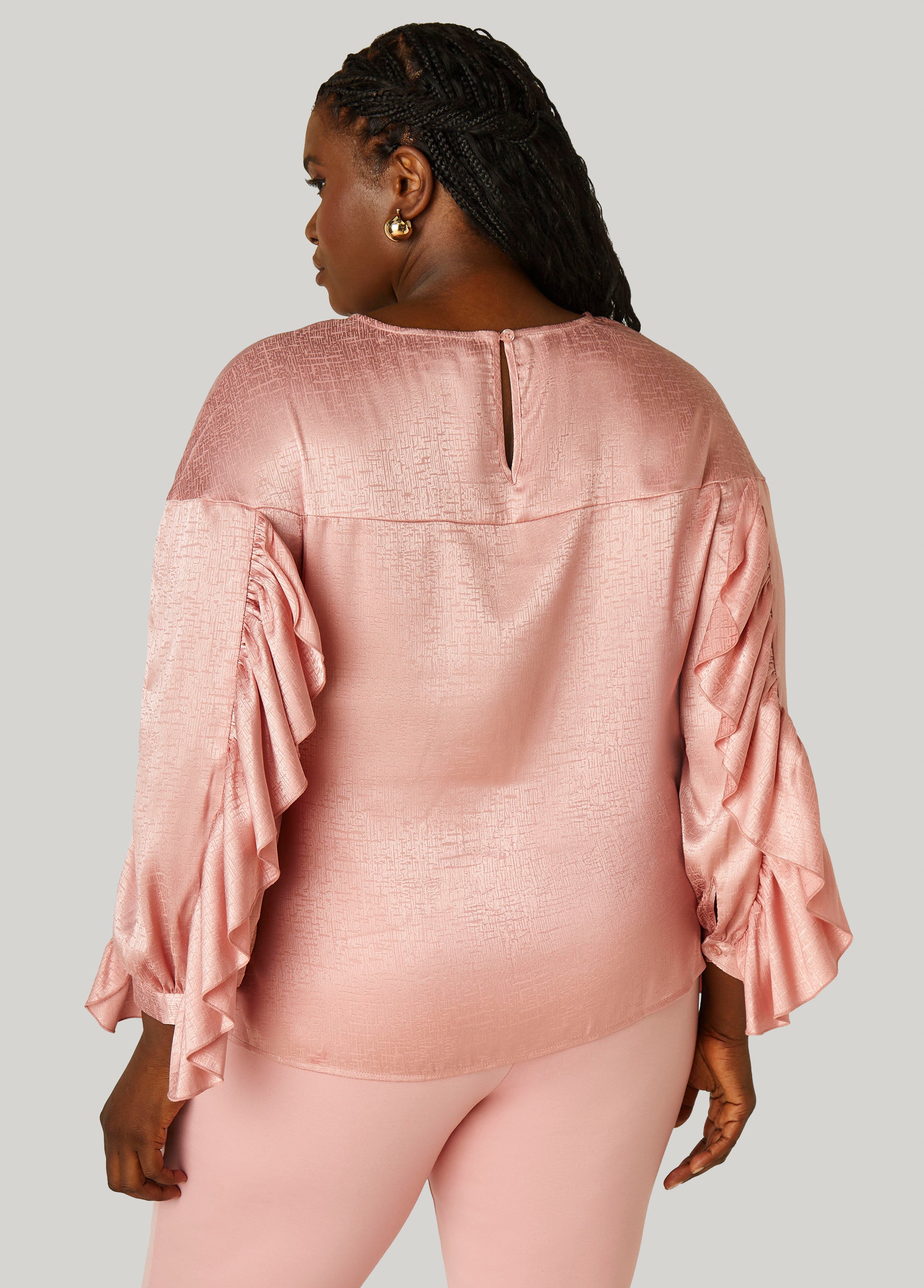 This textured-satin blouse is flirty with a wink. Ruffle trims tease, the satin shine and those button cuffs? Just the right mix of sweet and spicy.