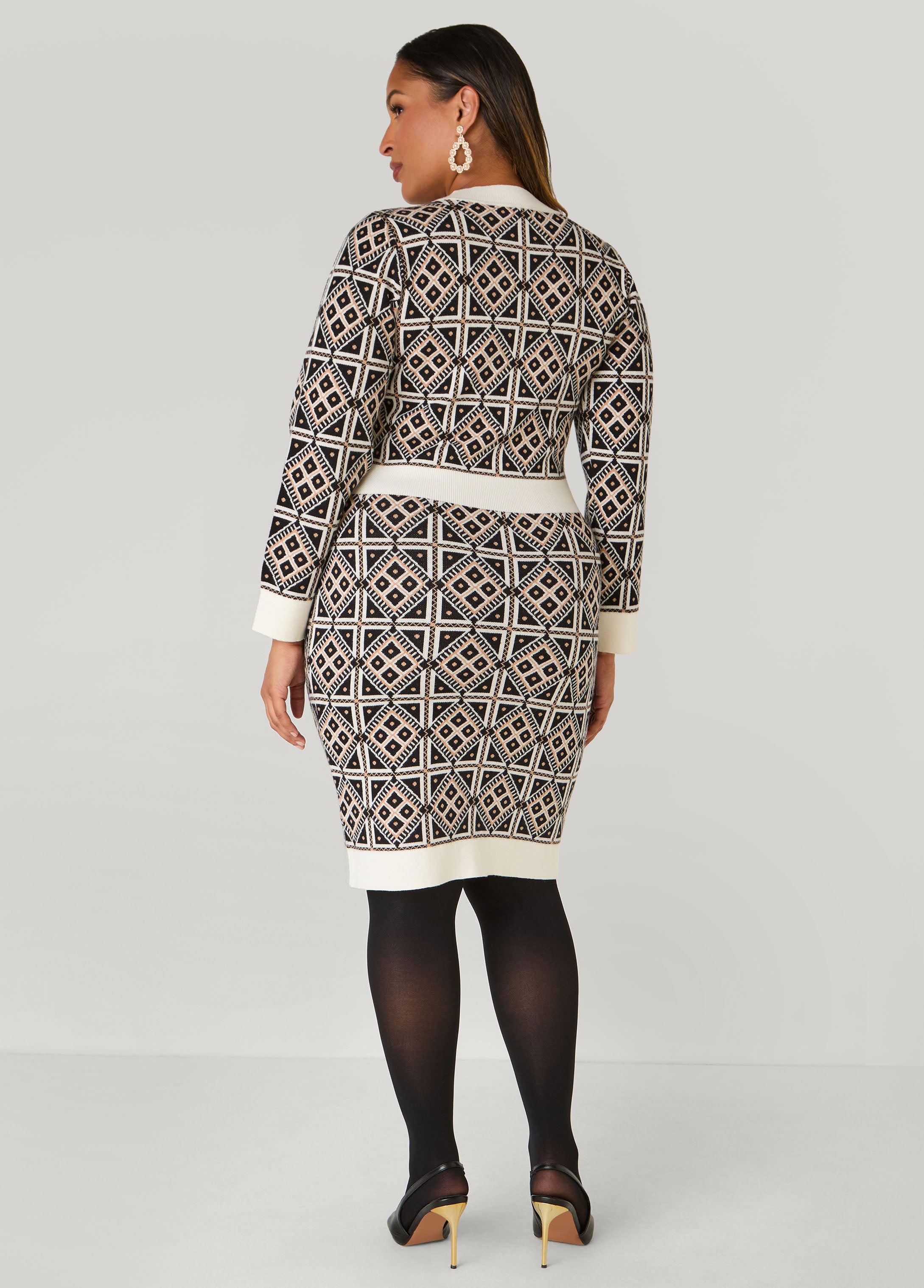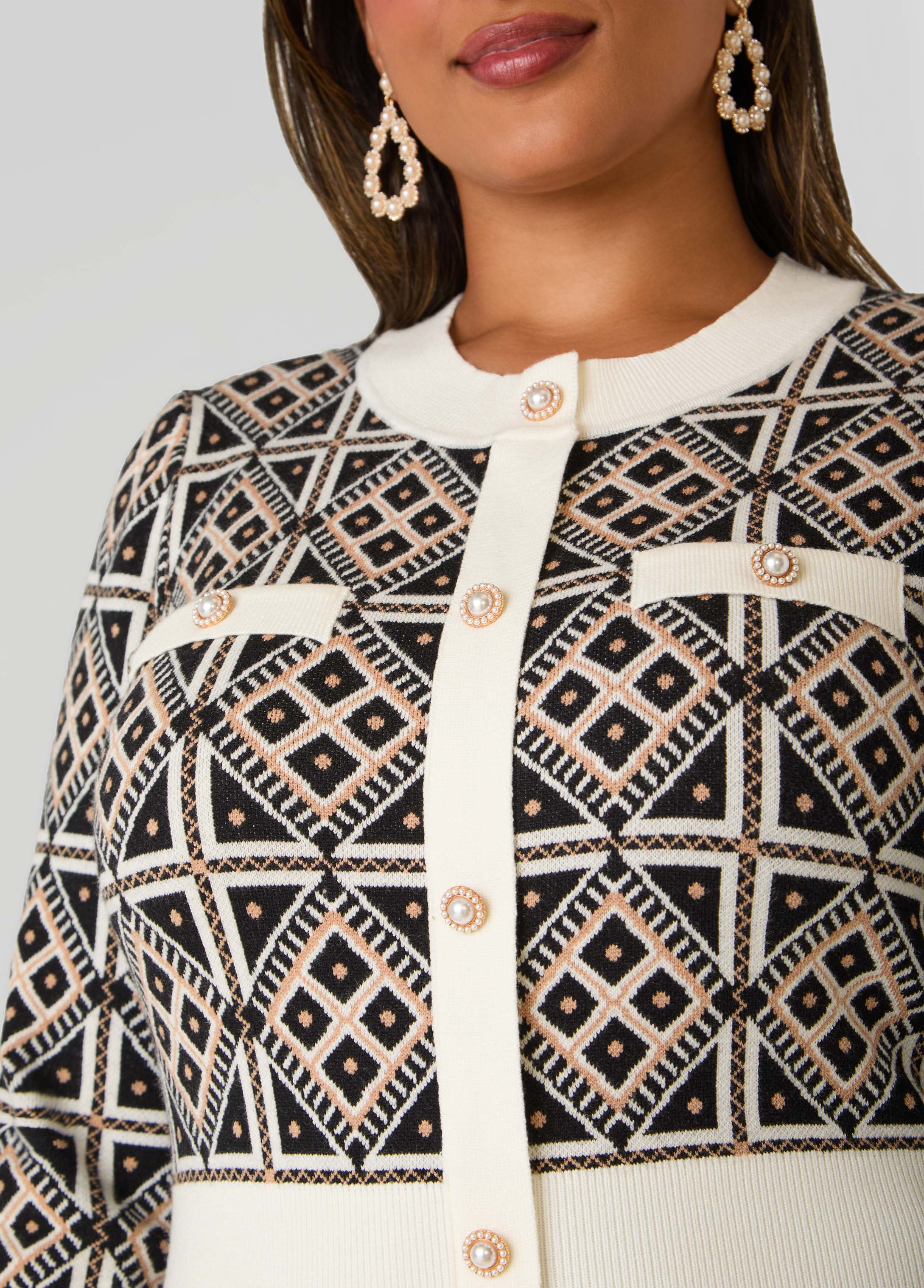 An intarsia-knit sweater dress is trimmed in faux pearl buttons giving knitwear a polished upgrade.