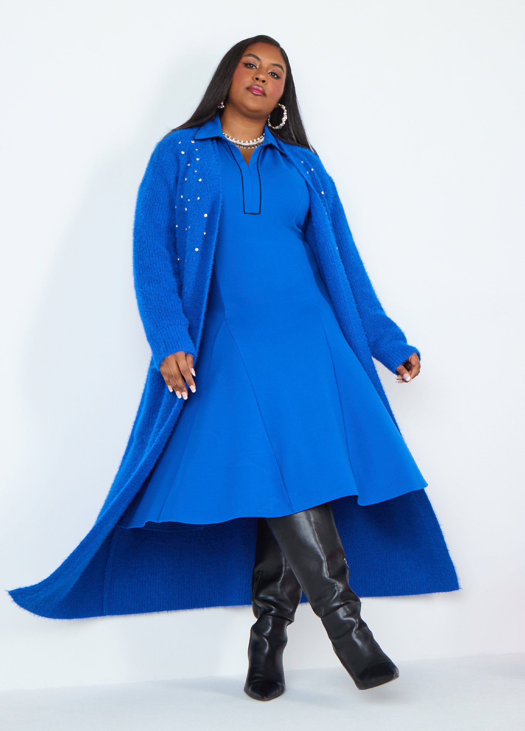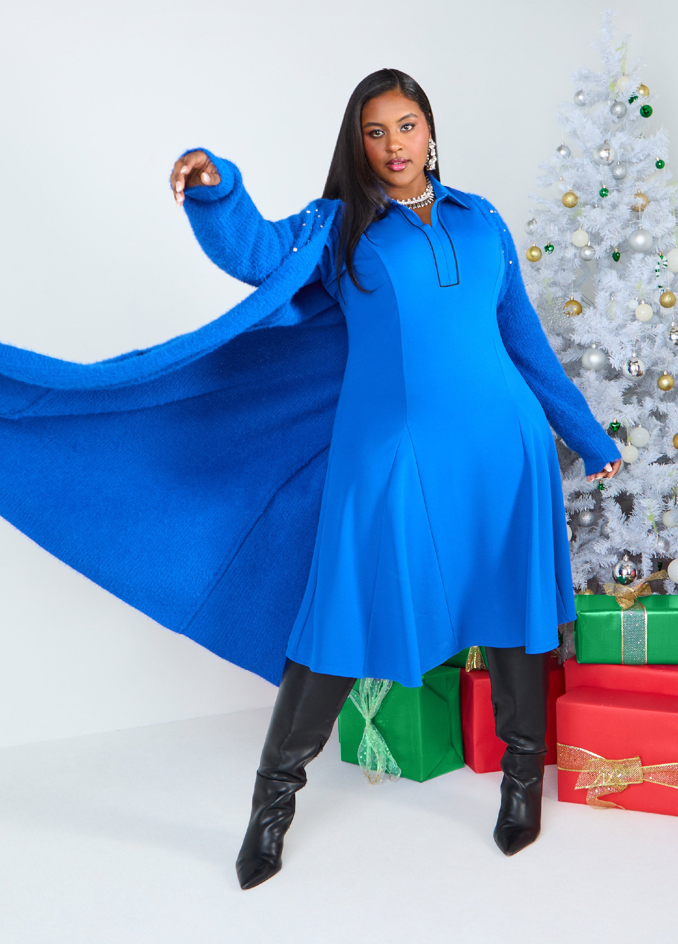 Designed with a flattering a-line and chic piped trims, this midi dress the perfect balance of comfort and class. Whether you’re headed to a candlelit dinner or a day at the office, this piece adds a touch of understated luxury to your wardrobe.