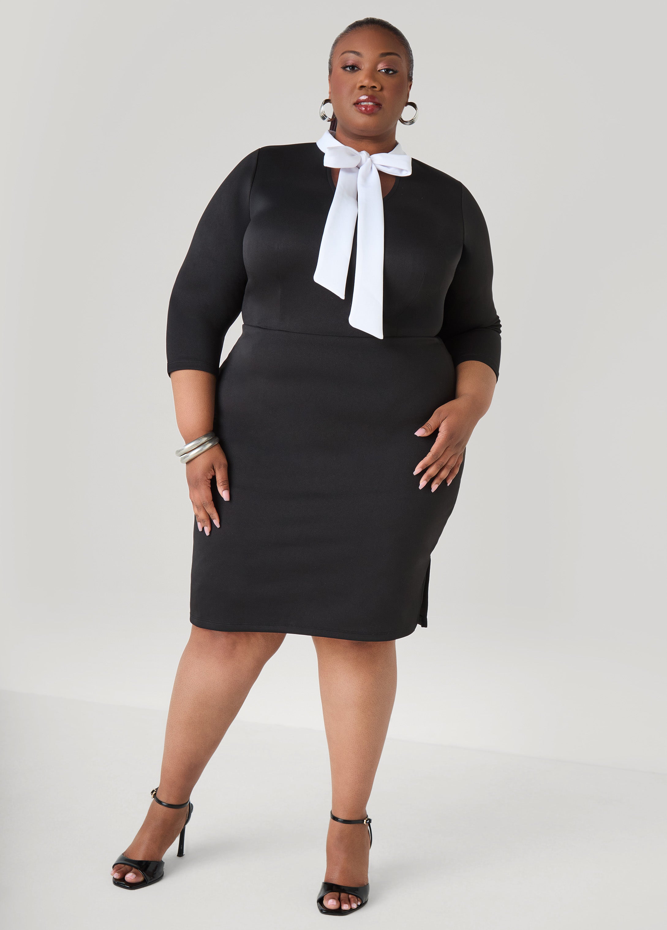 Monday to Sunday, this two-tone dress is a slay! Neckties are coquette-coded against a mindful cutout and sheath fit.