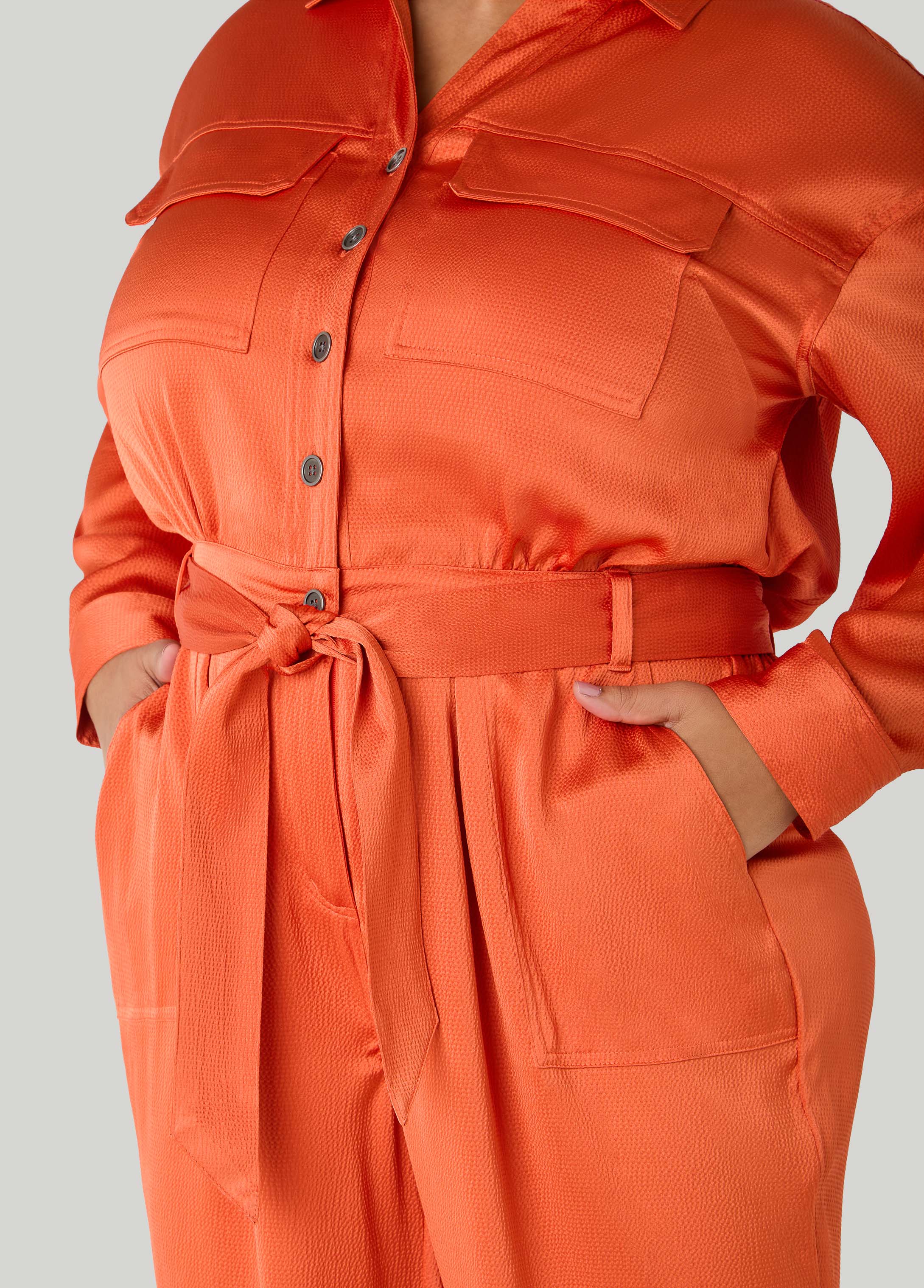 Glossy hammered satin sets the mood in this jogger-style jumpsuit that knows exactly what it’s doing. Button tabs at the sleeves invite a subtle reveal as sash ties pull the waist in close before falling into playful elasticized ankle cuffs. Smooth, sultry and a little bit bold, it’s the kind of piece that makes every step feel intentional.