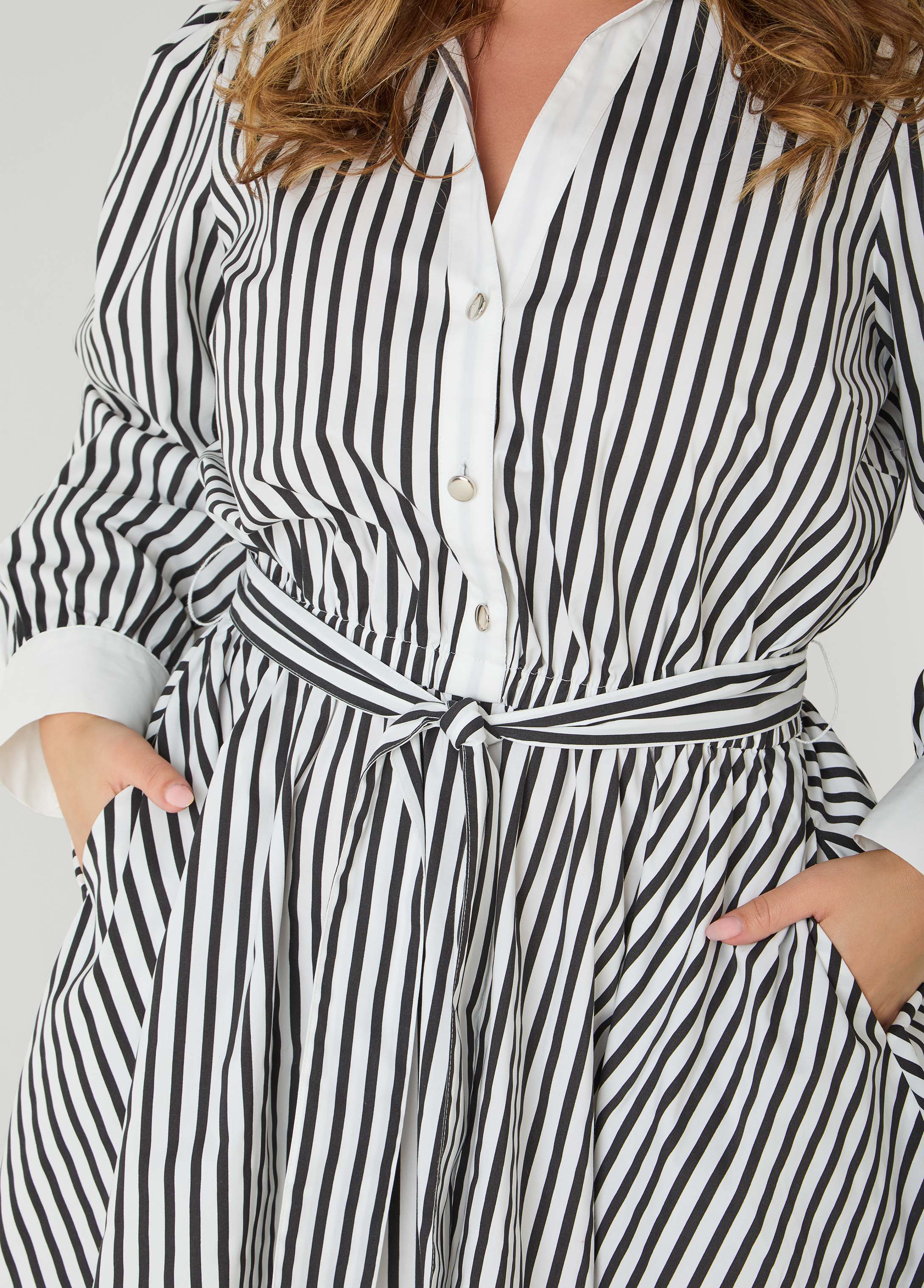 Striped poplin gives this shirtdress a crisp, tailored feel, balanced by sashes for a defined shape. An A-line skirt completes the look with easy movement and everyday charm.