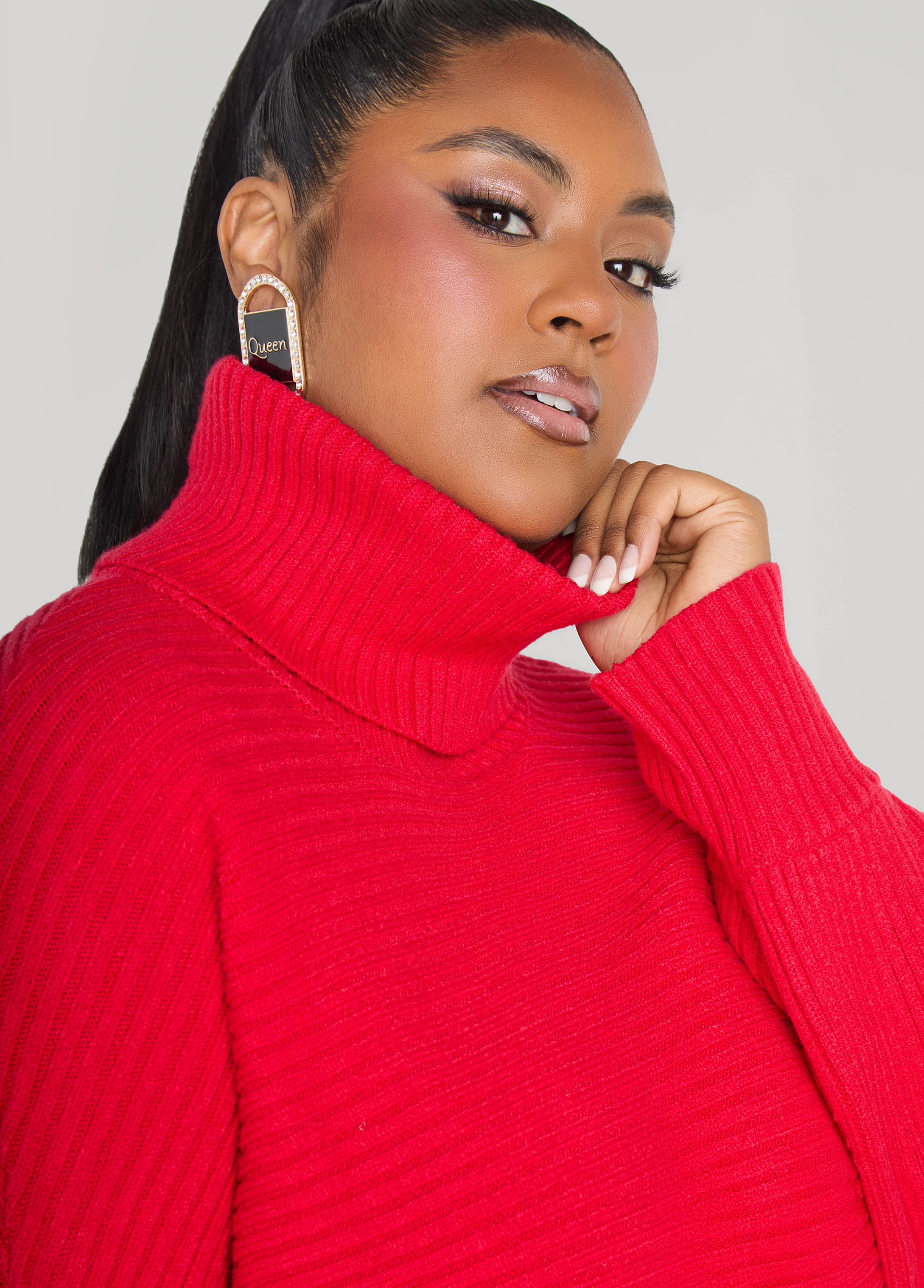 This turtleneck ribbed-knit sweater features dolman sleeves for a soft, flattering shape. Slip it on with the matching mini skirt for a duo that's current, sexy and chic.