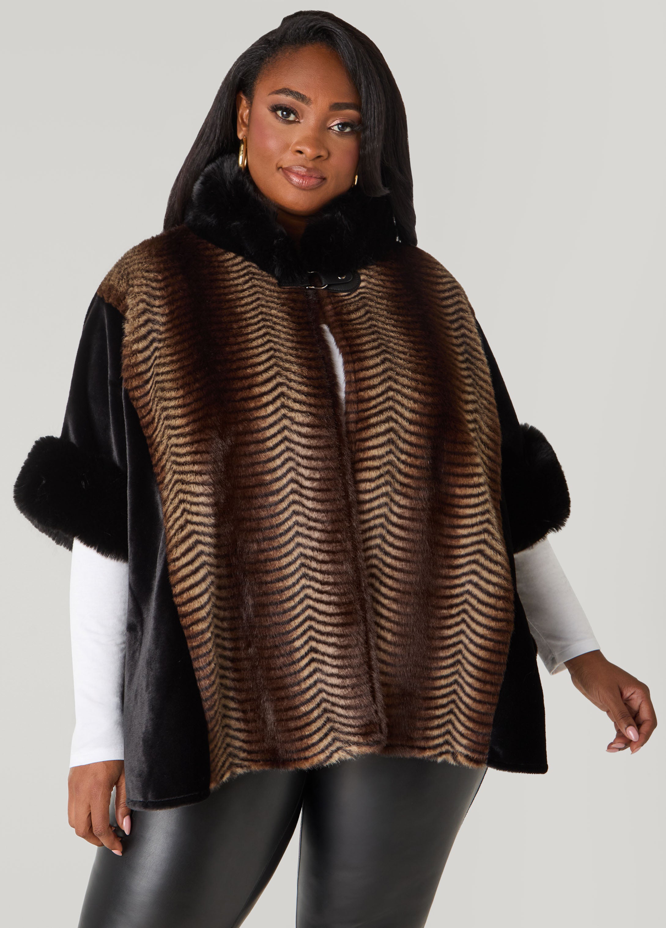 • Jessica McClintock faux fur ruana with animal print panels and faux leather trims. Hook fastening at front.
