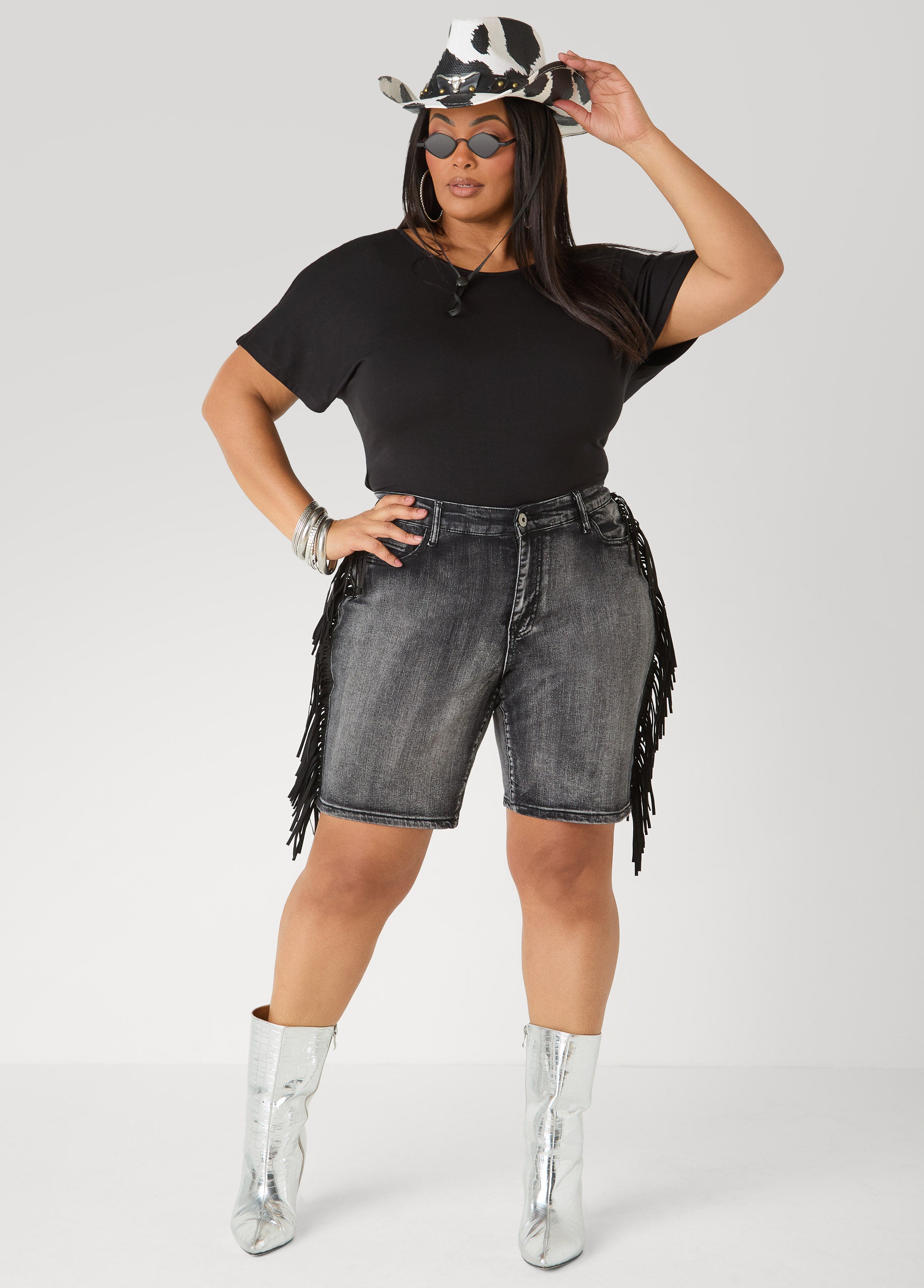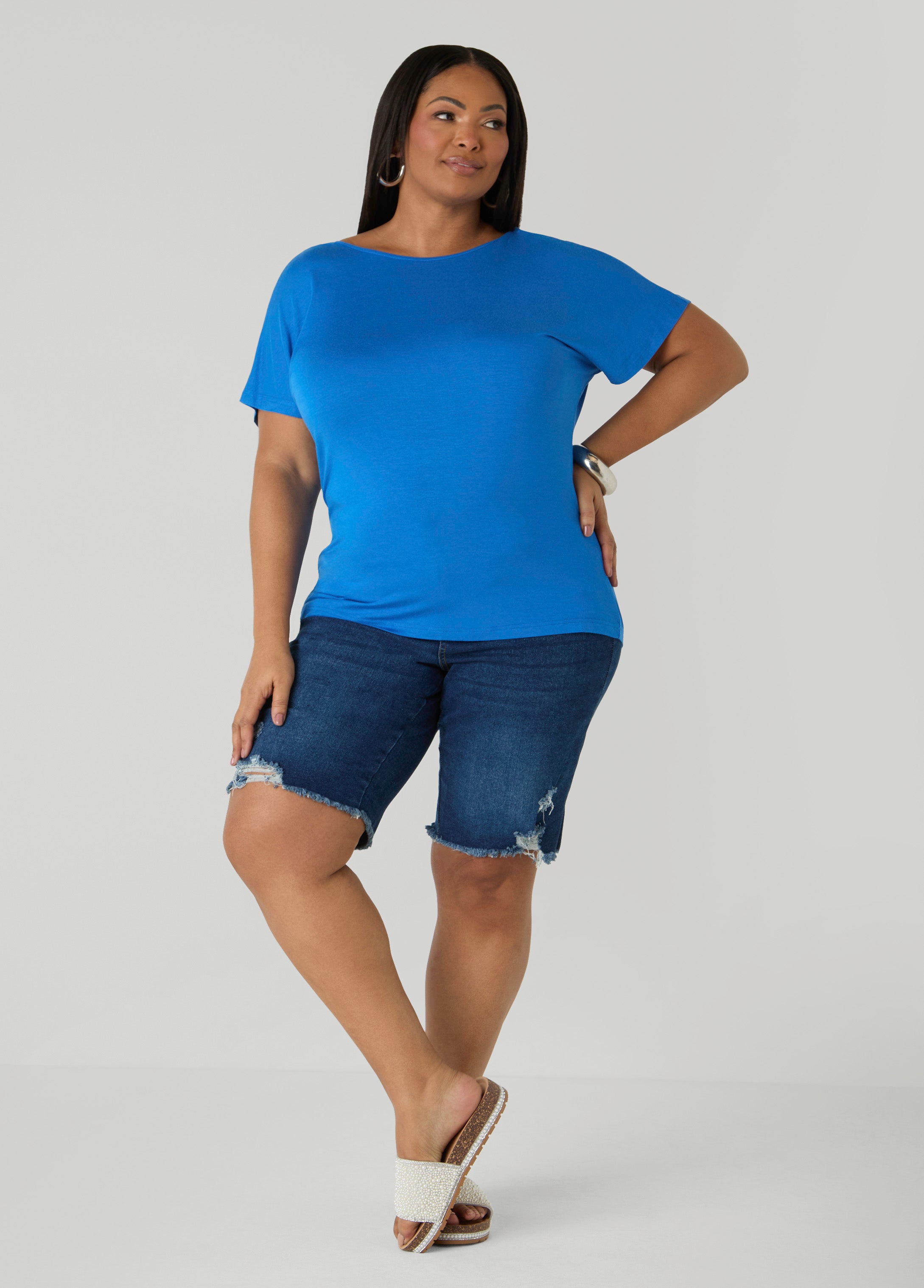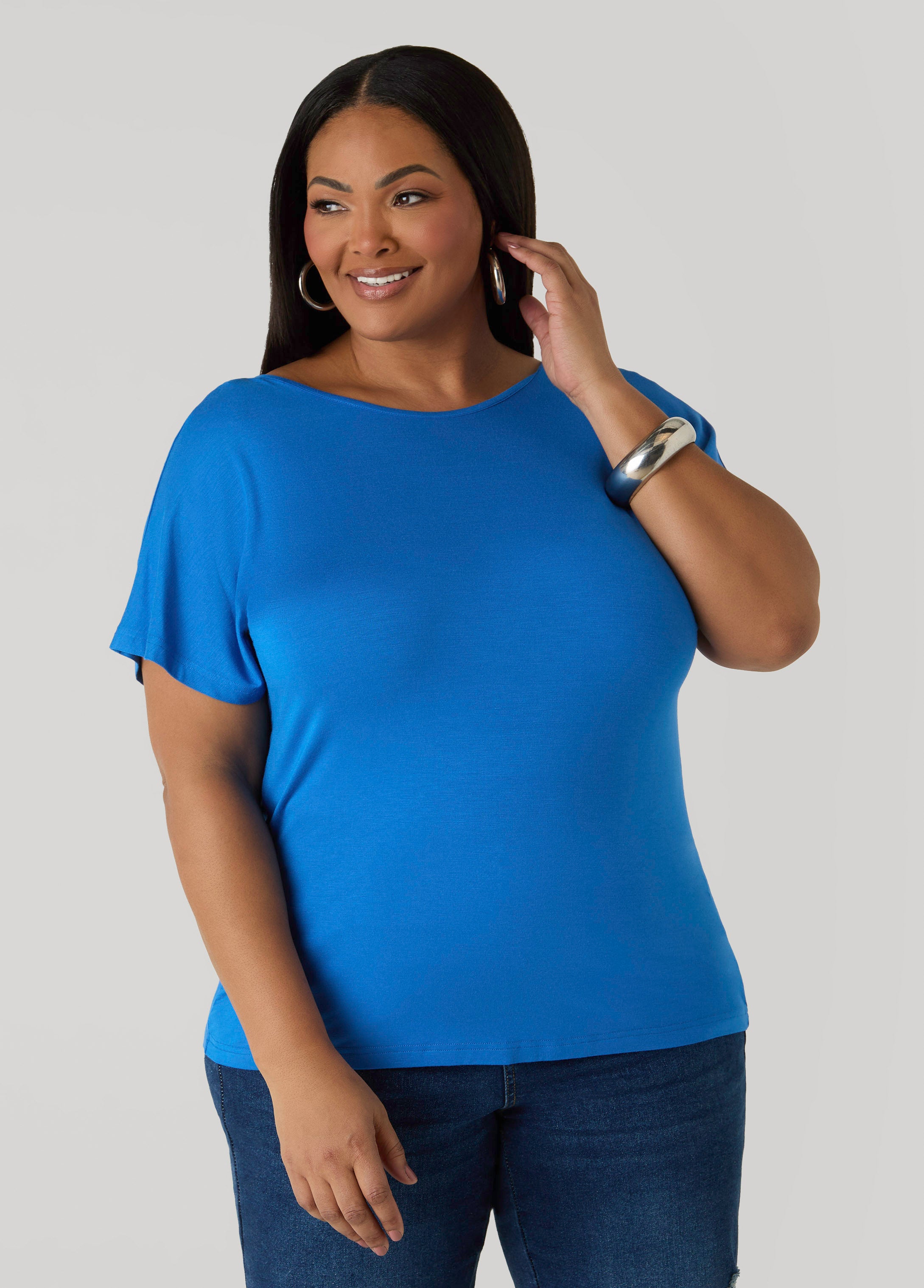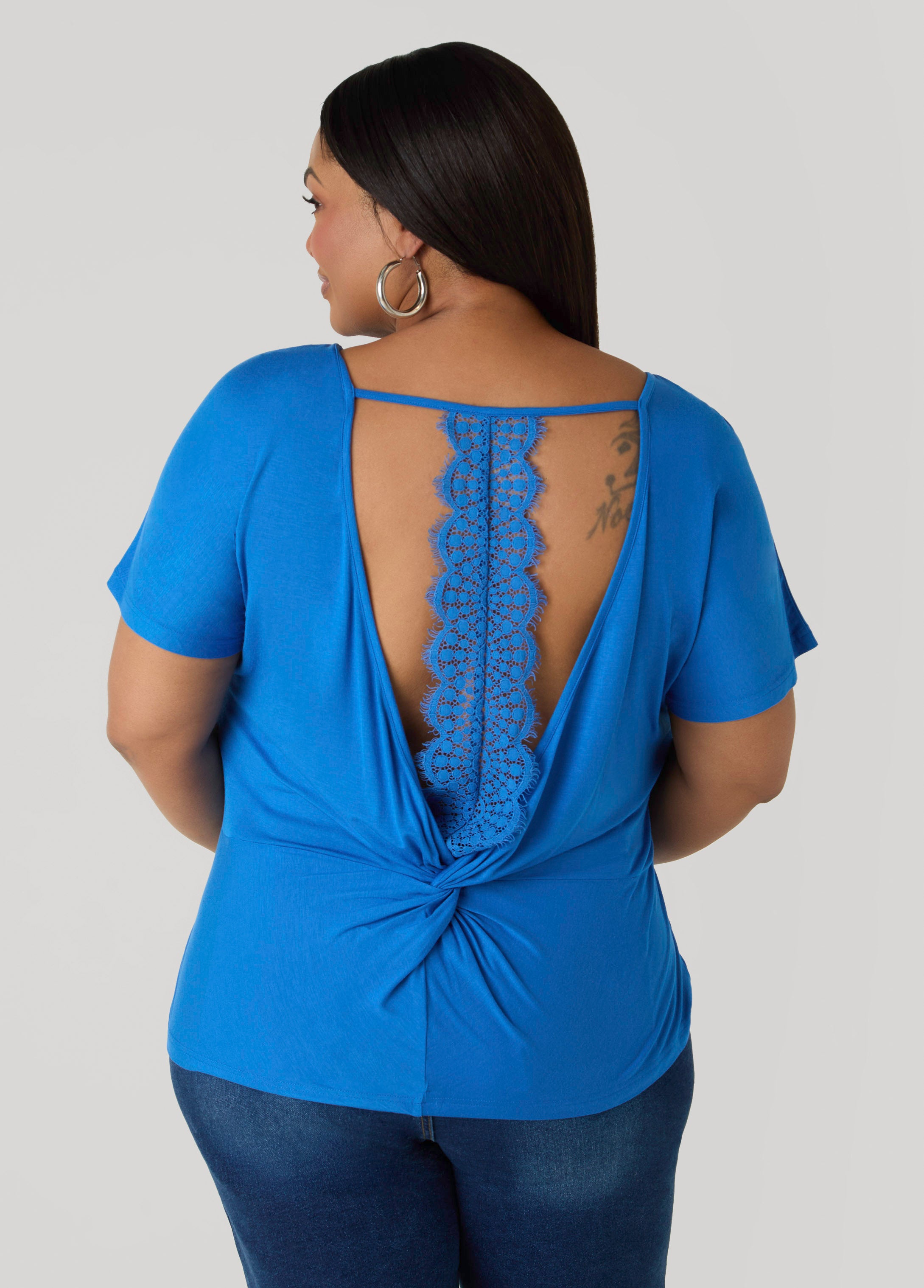 Business in the front, SURPRISE in the back. We take the casual look of a short-sleeve tee & remix it with a lace panel that traces the middle of the open back before landing at a knotted detail.