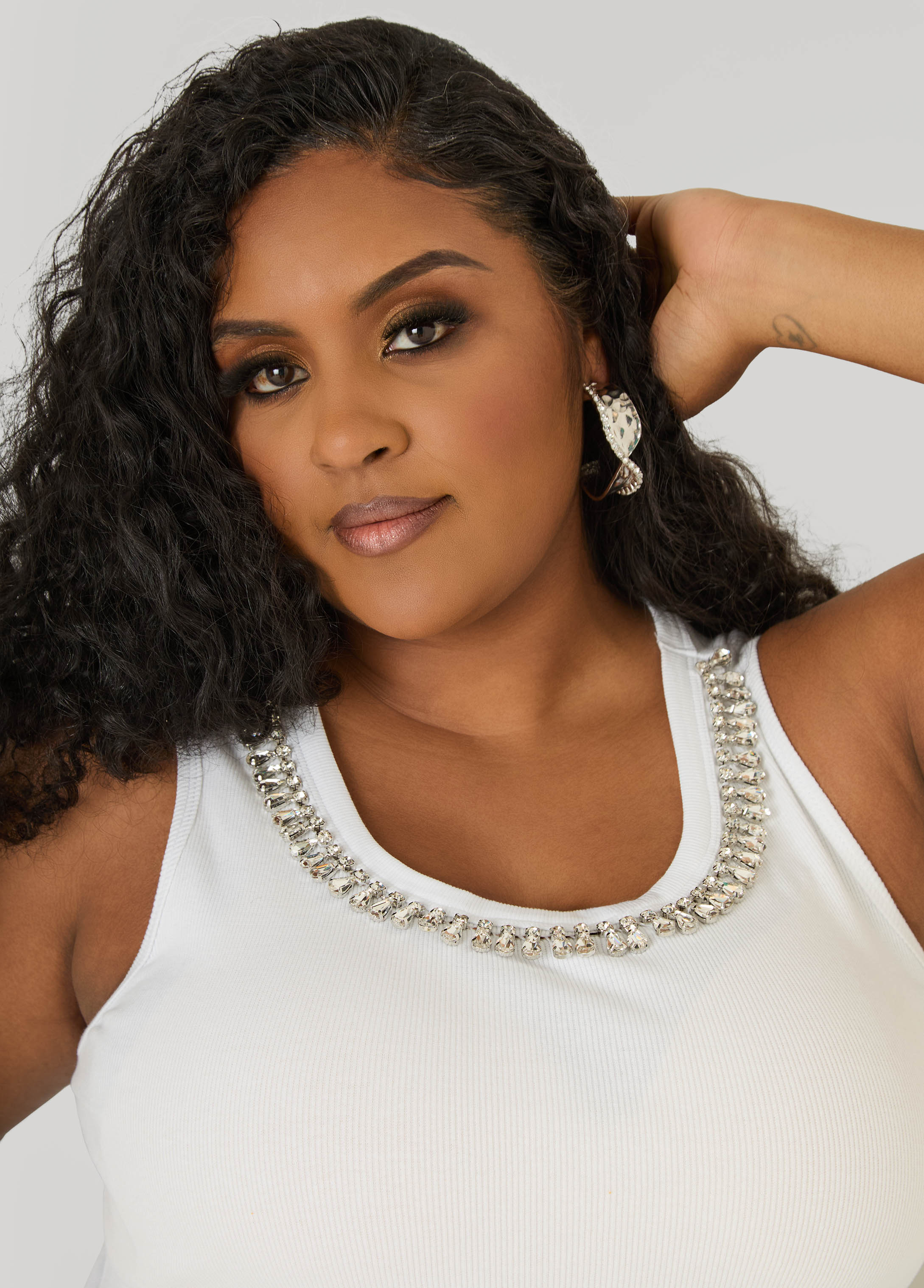 We understood the assignment so you don’t have to accessorize. This ribbed stretch-cotton tank comes with built-in shine, crystal details laid just right to mimic a necklace moment without the effort.