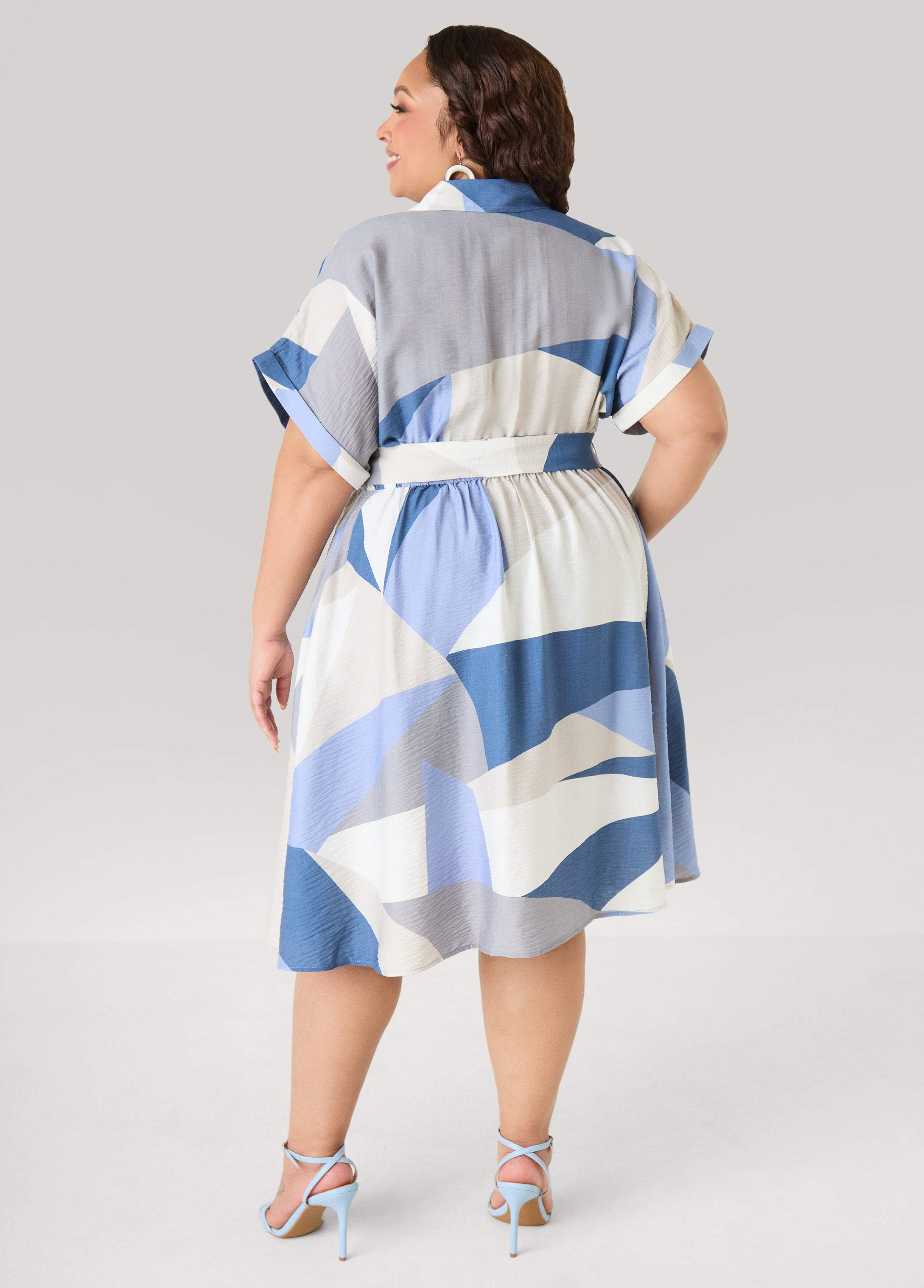 A modern geometric print lends graphic appeal to this linen-like shirtdress detailed with cuffed sleeves and a sash belt for a summery, chic fit.