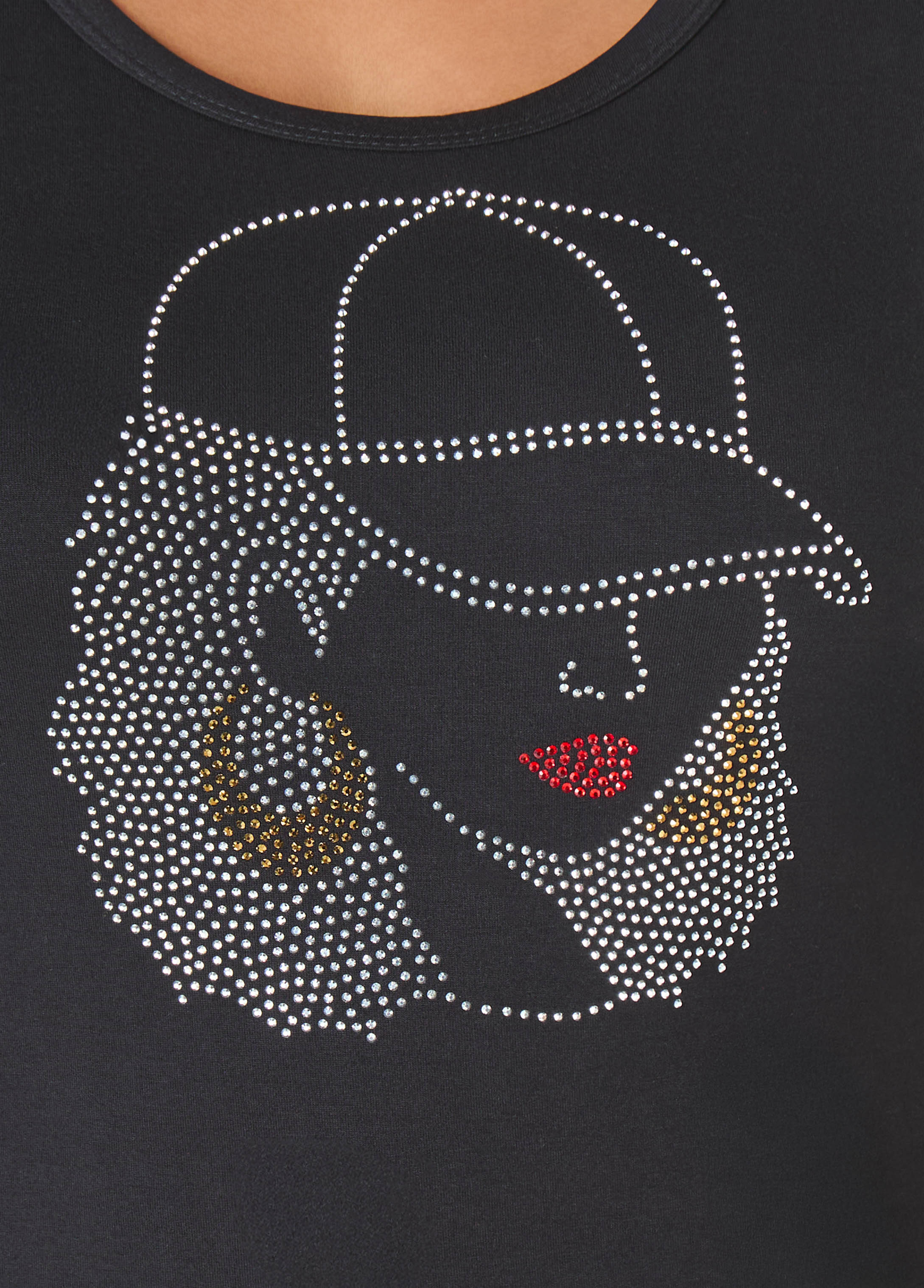 You're an incognito cutie in our stretch-knit tee adorned with multicolored crystals shaping the profile of an unsuspecting baddie.
