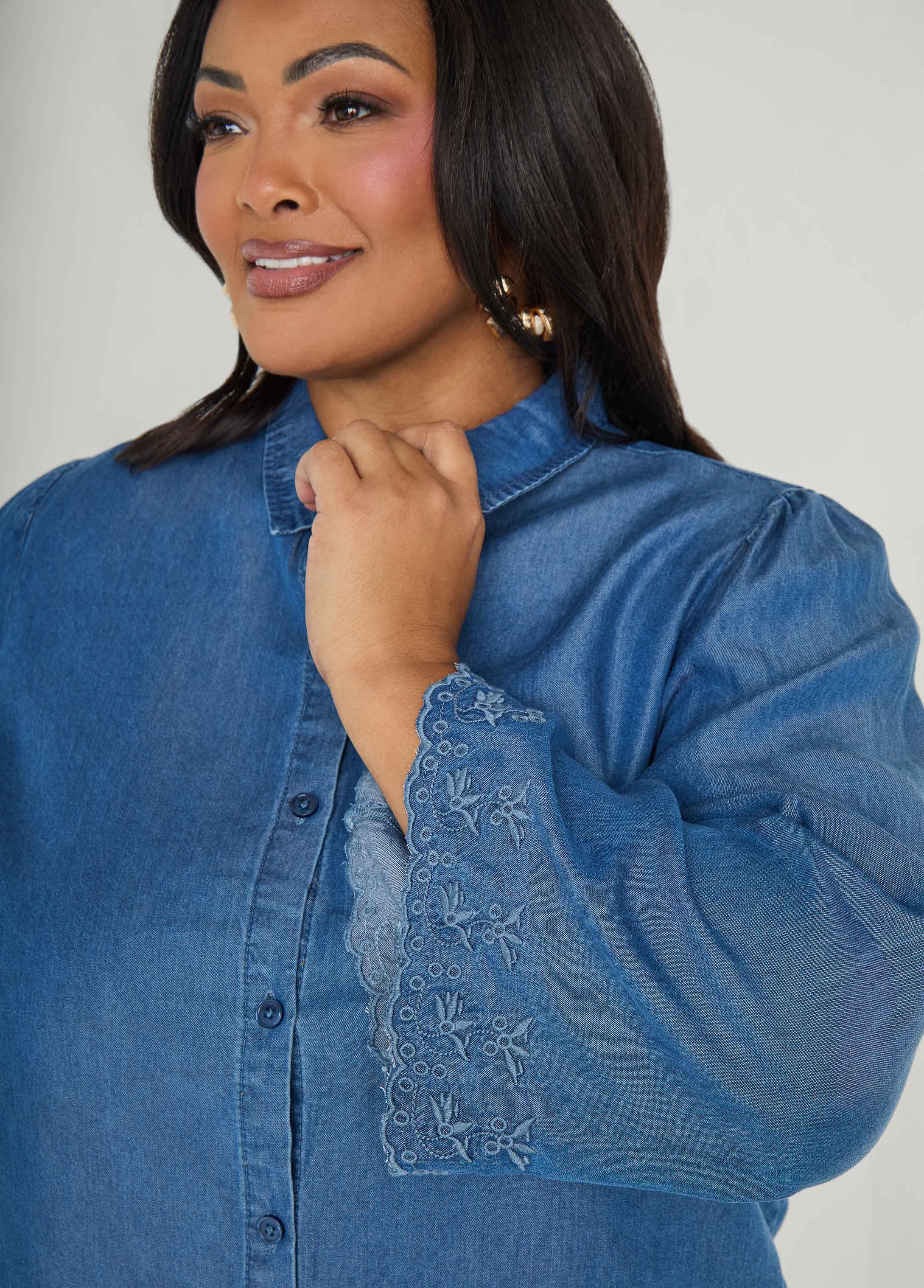 Classic with a feminine twist, this chambray shirt features embroidered eyelet sleeve cuffs and a timeless button-front design. Easy, polished, and endlessly versatile.