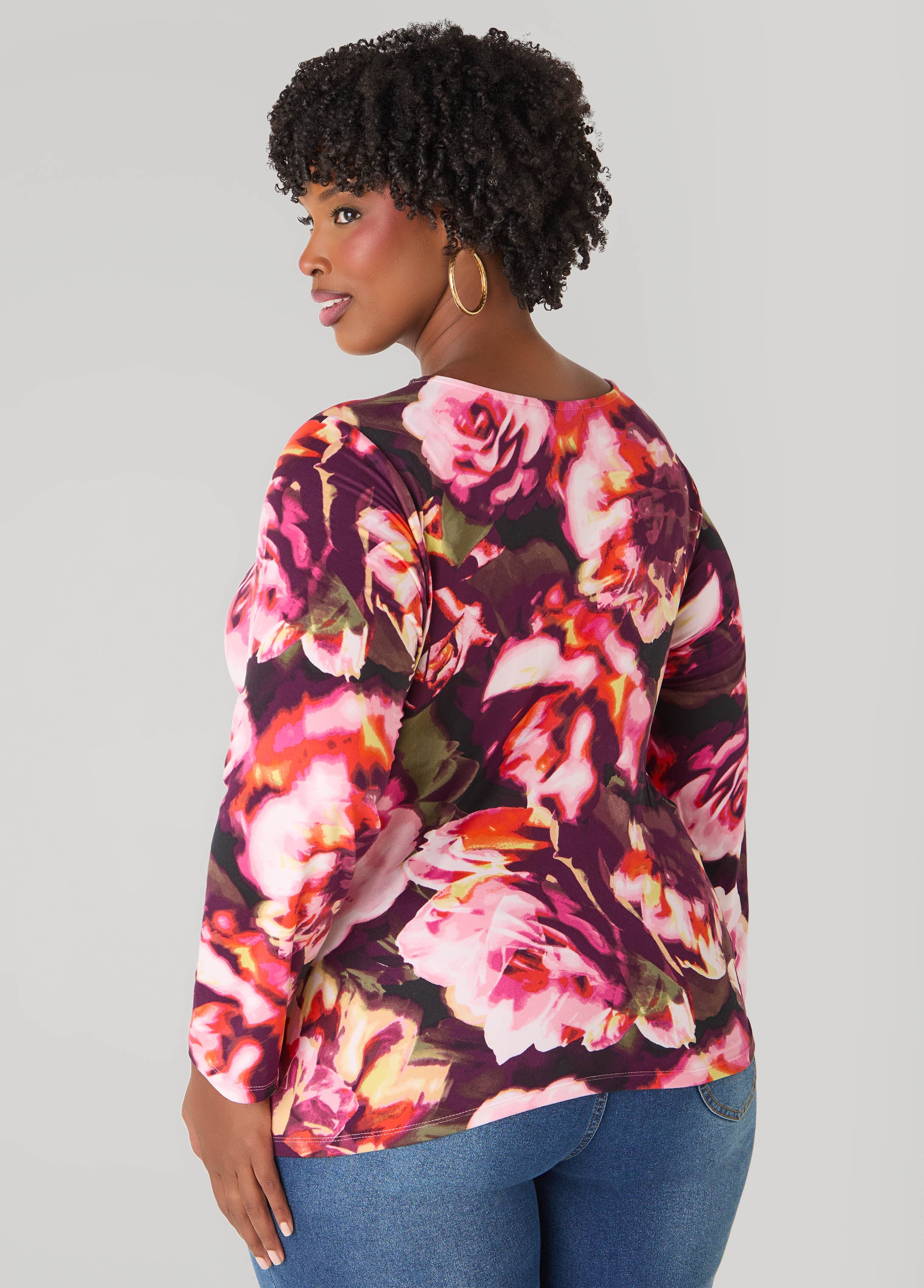Flirty and flattering, this floral stretch-knit top shows off an asymmetric neckline and soft ruching that draws the eye just right. A statement piece that pairs easily with your favorite denim or something dressier.