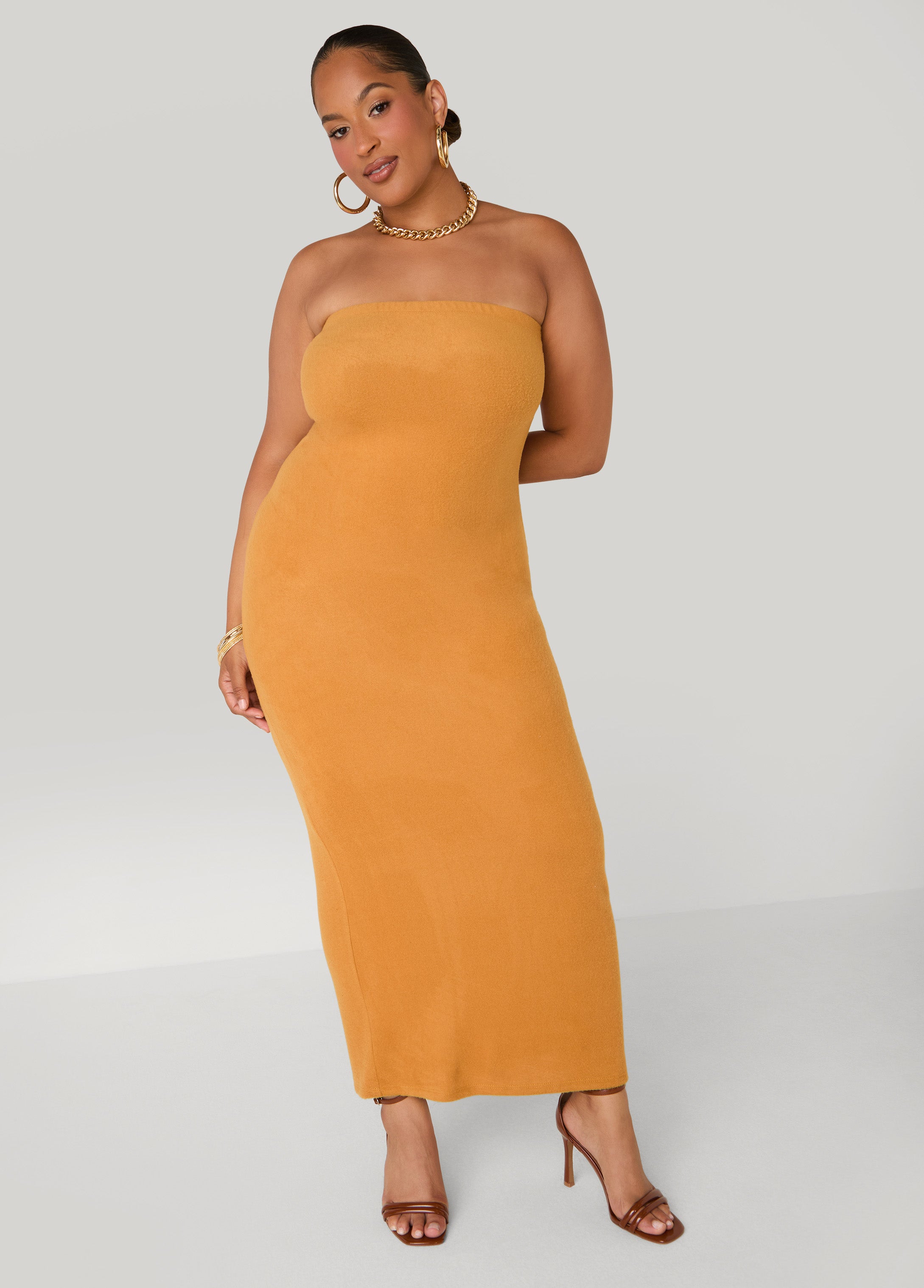 Strapless brushed-knit maxi with a sleek slip-on fit. Layer with the matching bolero for a two-piece set that’s all modern polish and effortless style.