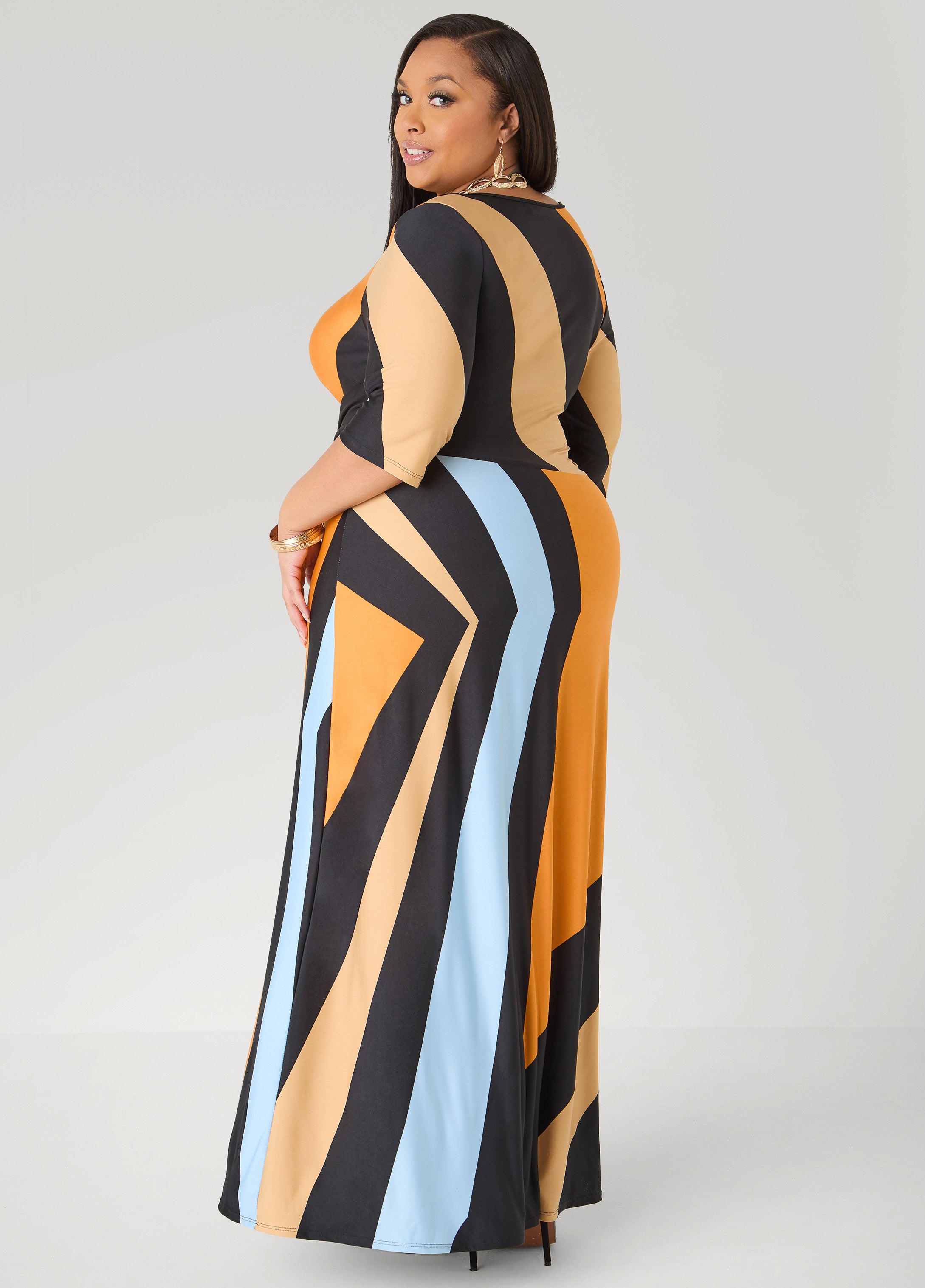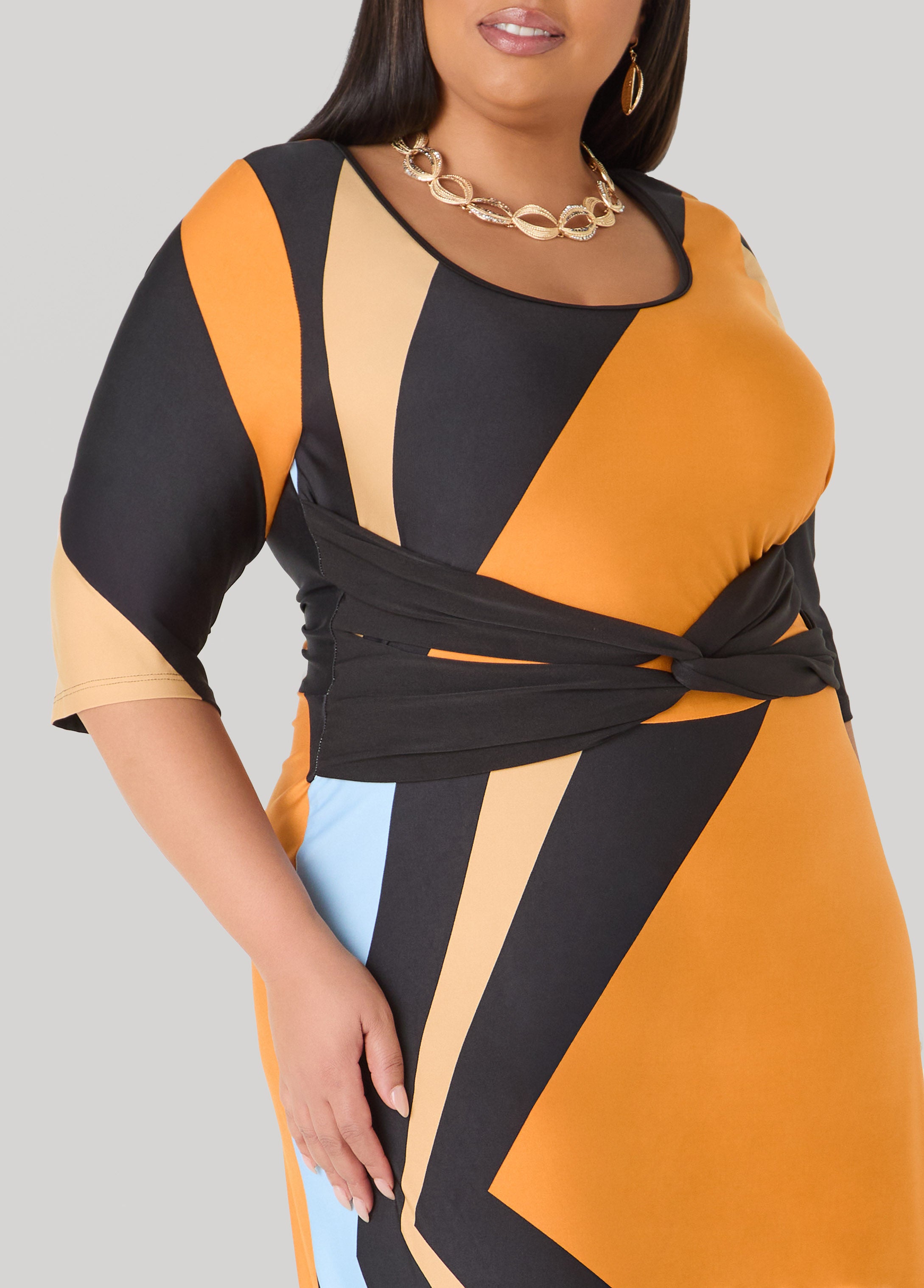 Geo print gets a flattering twist in this stretch-knit maxi. The knotted waist detail cinches & slays, creating curves and movement that feels empowering & chic.
